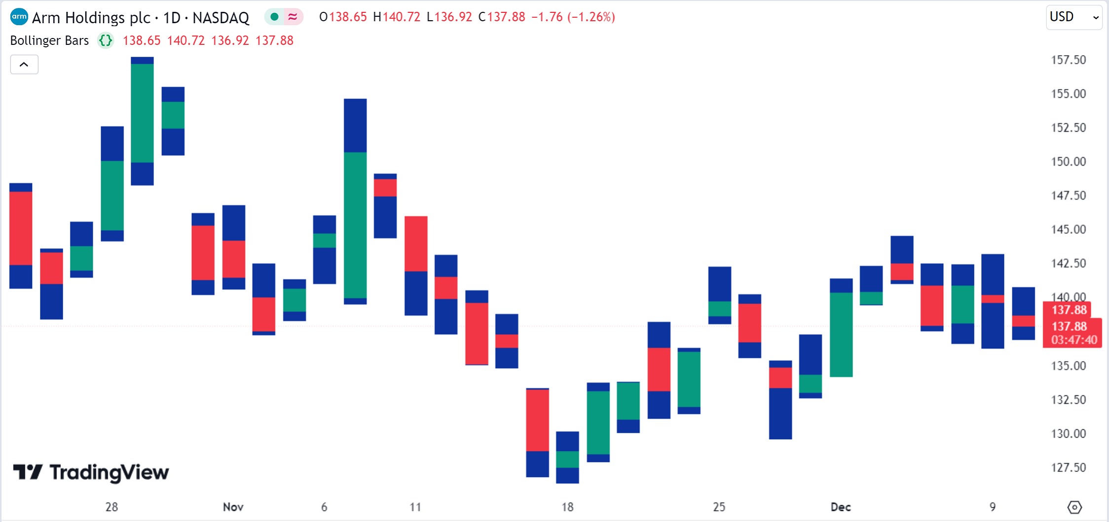 Bollinger Bars指标是由布林带的创始人John Bollinger开发的工具。该指标通过保持蜡烛的固定宽度并使用不同的颜色来区分蜡烛的主体和灯芯,为蜡烛图提供了另一种视觉效果。交易者可以使用该指标来识别蜡烛图表形态和见解,例如累积/分布趋势、压缩期和大范围日。