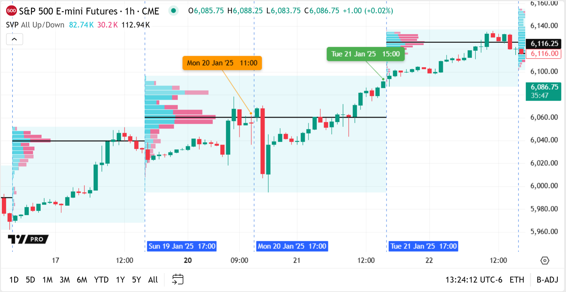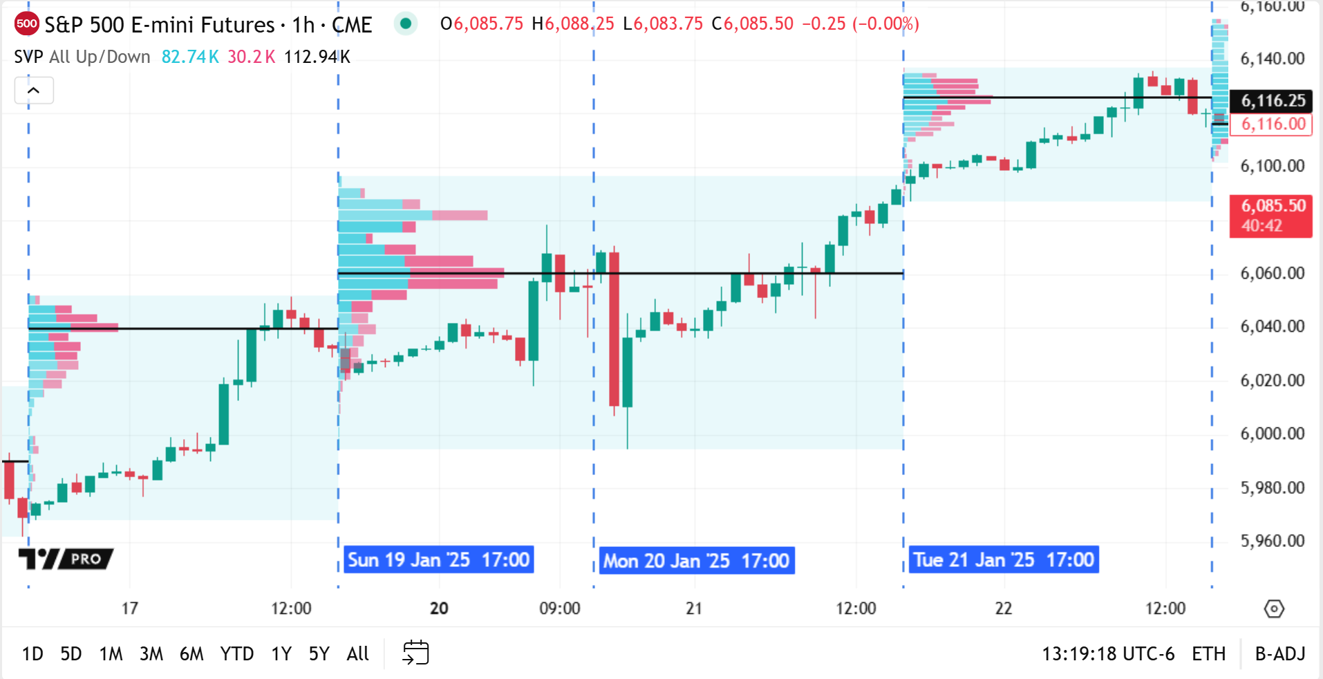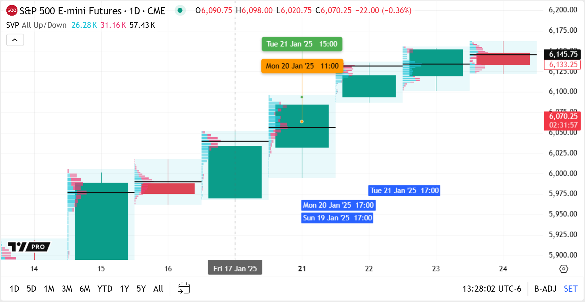 当我们在“ES1!”商品的日内图上添加交易时段成交量分布图指标时,我们可以看到修改后的假日交易时段。周一的交易时段(通常为周日17:00 – 周一16:00 CT)现在因假期而缩短,结束于11:00 CT,并与周二的交易时段(周一17:00 – 周二16:00 CT)合并为一个较长的“每日”交易时段。虽然指标似乎在这里错过了交易时段重置,但实际上它正确地表示了交易所设定的交易时段日期:
