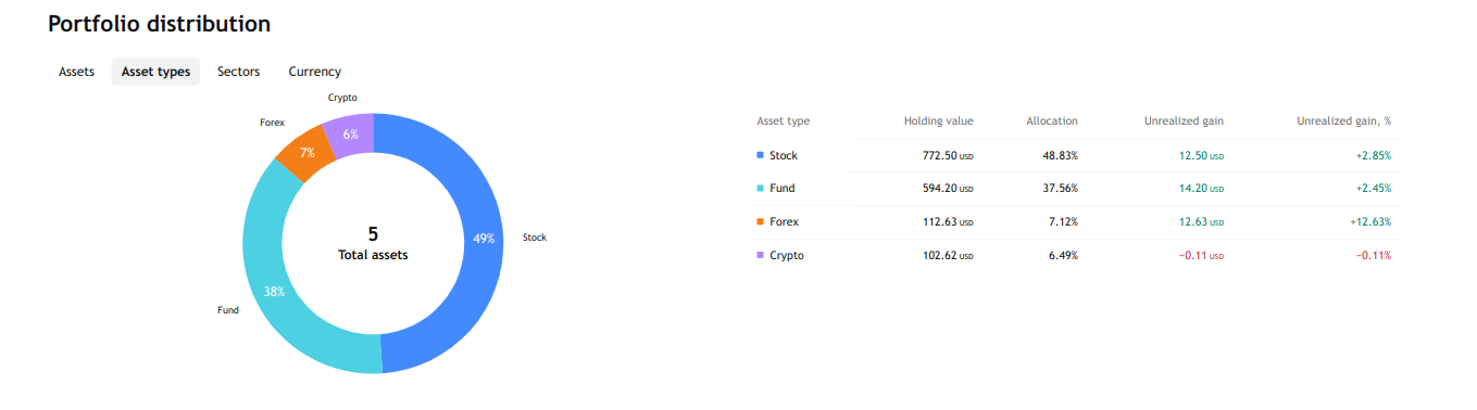 - Asset types — assets are grouped by type (for example: Stock, Crypto, Forex, etc.).