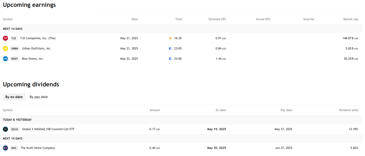 Displays a list of stocks with upcoming dividend events and allows the user to filter them in two ways: by ex-date or pay date. When selecting one of these filters, a table is formed that includes the following columns: