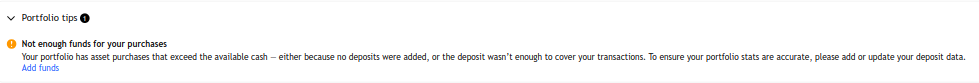 When the system detects insufficient funds at the time of an asset purchase, you will see a notification prompting you to add a cash transaction.