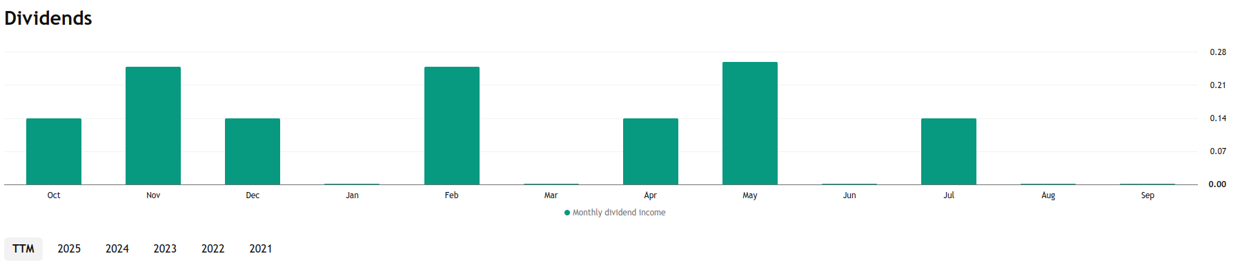 此图表显示您投资组合的每月股息收入。每个条形代表特定月份收到的股息总额。