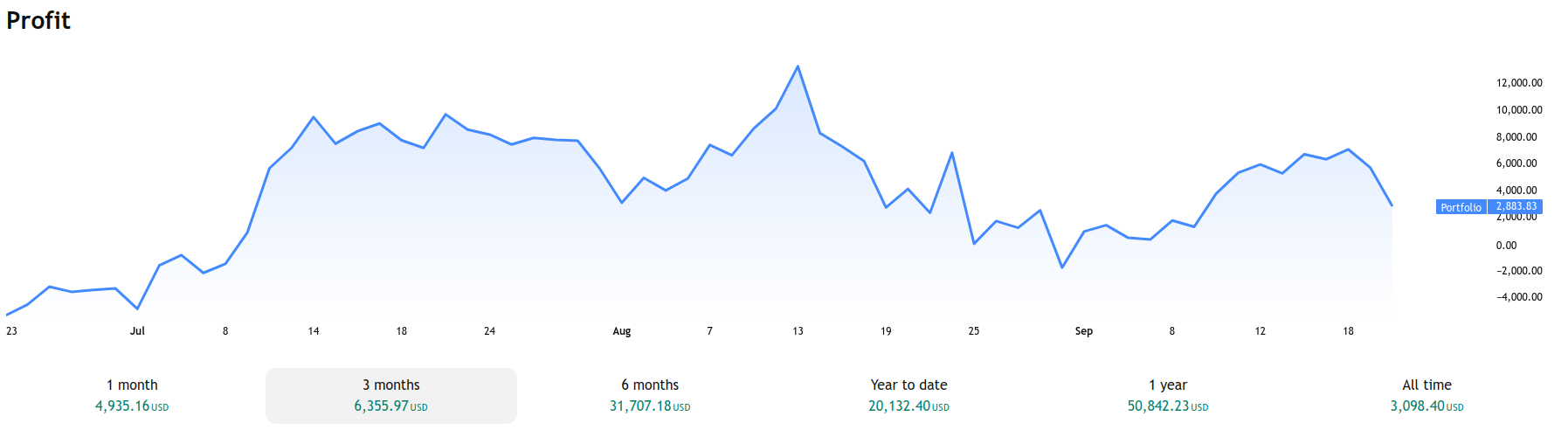 You can explore results across different periods — 1 month, 3 months, 6 months, year-to-date, 1 year, or all time using the tabs below the chart.