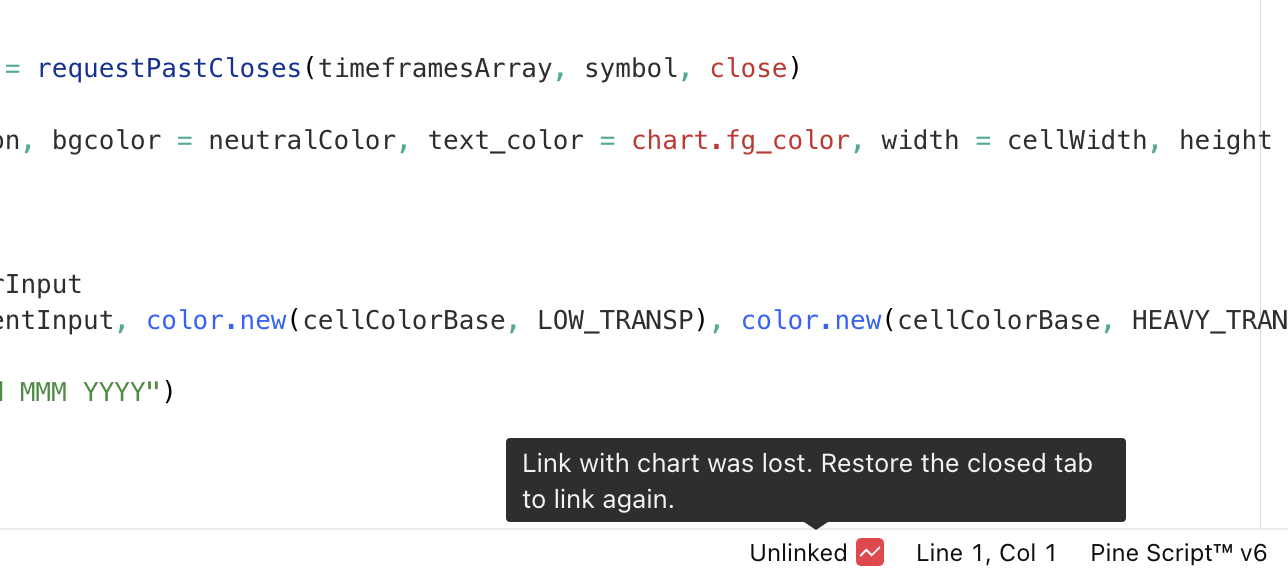 每当您从图表打开分离的选标签页或窗口时,它都会保留指向该图表的链接,允许您从分离的页面添加和更新脚本。链接的状态可以在编辑器右下角的状态行中找到。将鼠标悬停在它上面会进一步解释它的含义,以及如果可能的话,可以做些什么来恢复链接。
