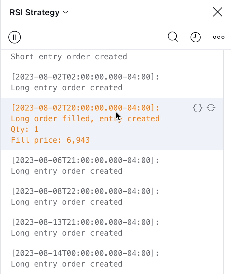 每个日志条目前面都有一个时间戳。对于历史K线,它是K线的开盘时间;对于实时消息,它是当前时间。较新的消息出现在窗格底部。历史K线仅显示最后 10,000 条消息;实时消息附加到这些消息上。