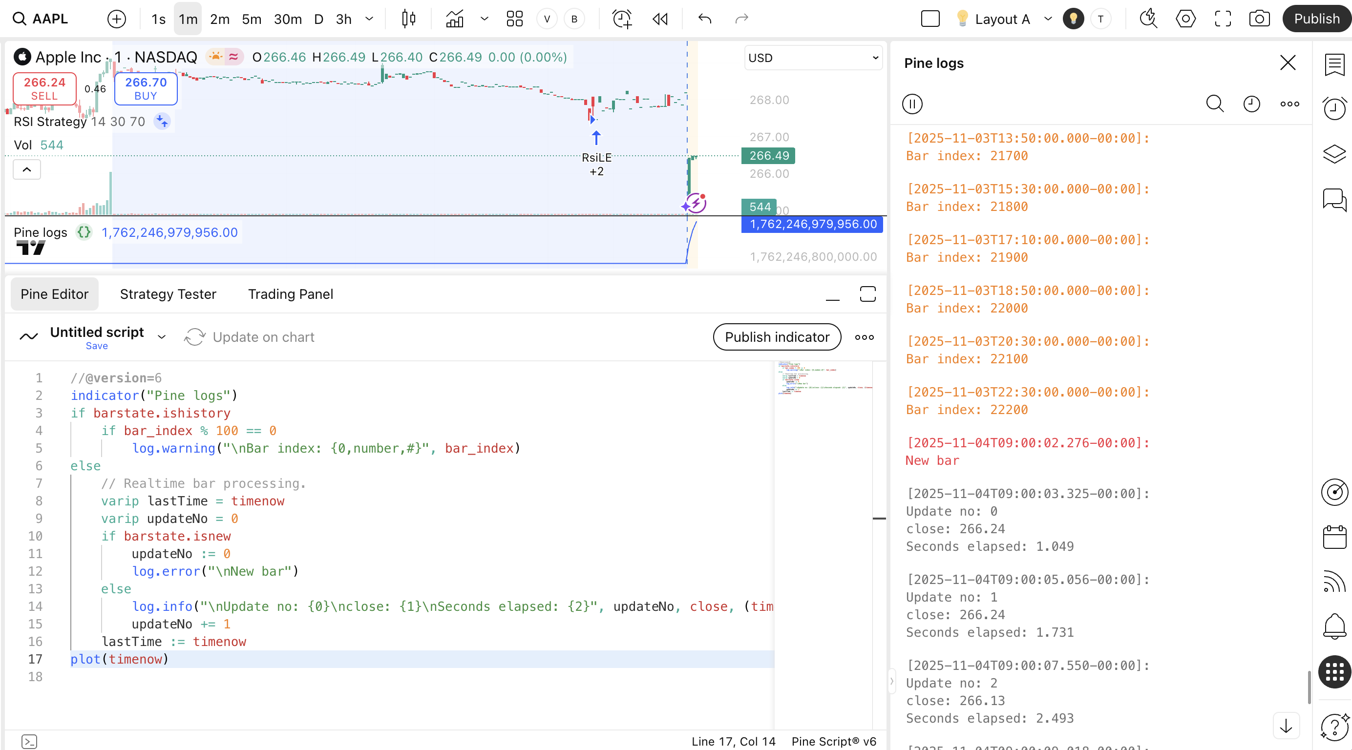 在图表上添加脚本后,您可以打开Pine日志。使用入口点之一: