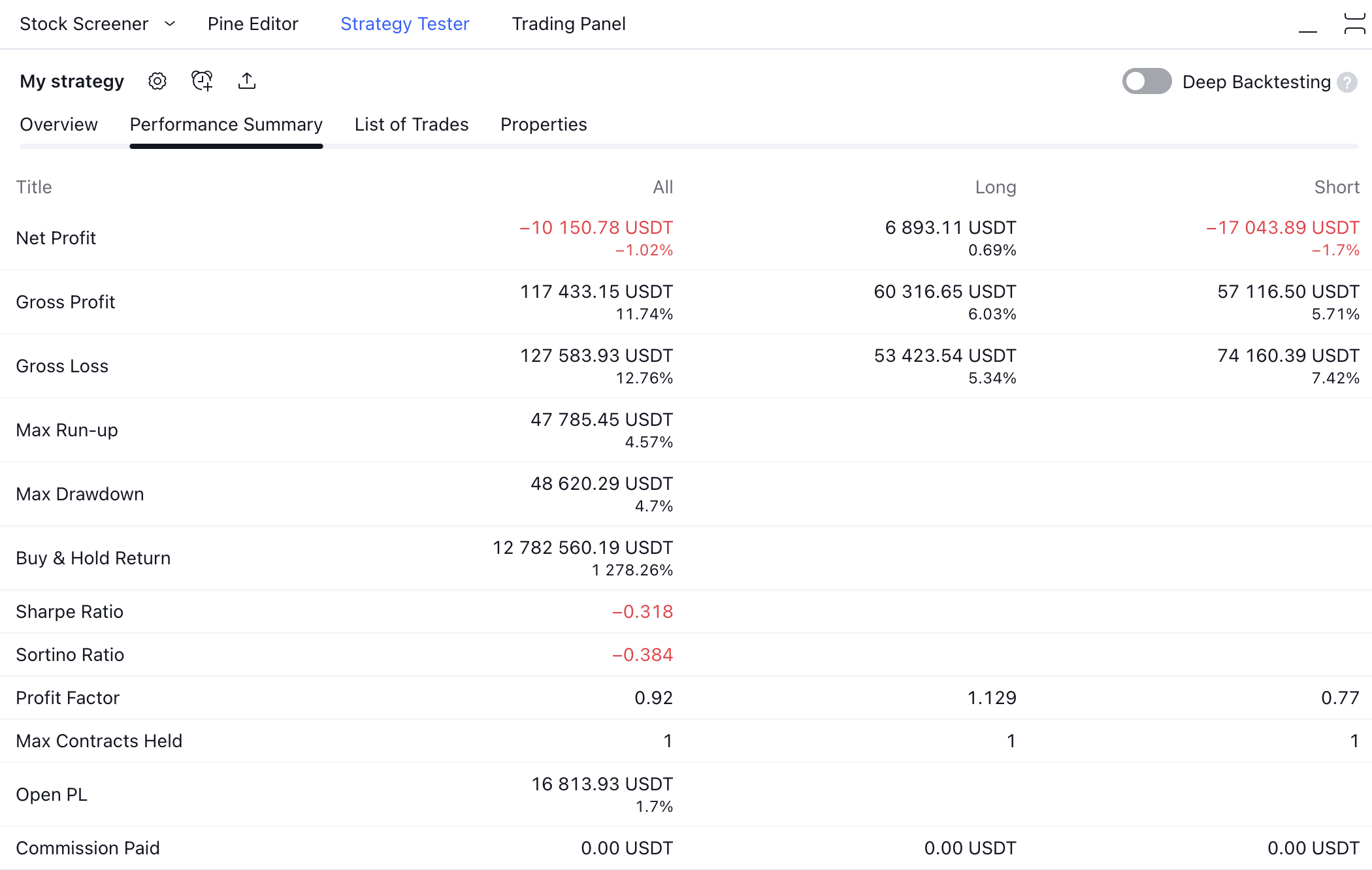 This tab displays all available performance metrics for the strategy including Net Profit, Gross Profit, Max Drawdown and more. It looks like this: