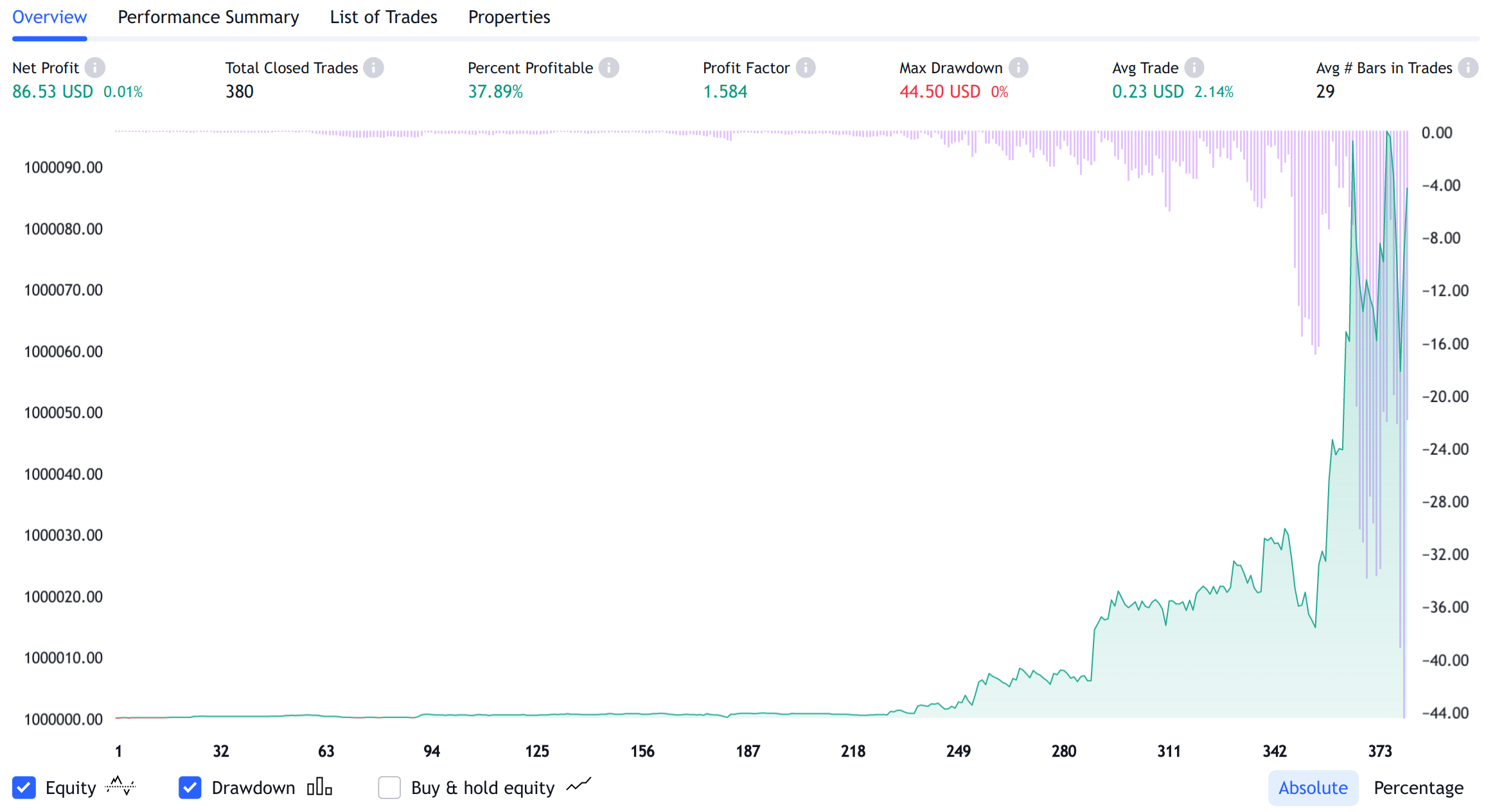 This tab provides key performance metrics for the strategy.At the top of the tab are the metrics of the same name from the Performance Summary tab. Clicking anywhere in the Overview chart will bring your main chart to the close of the corresponding trade.