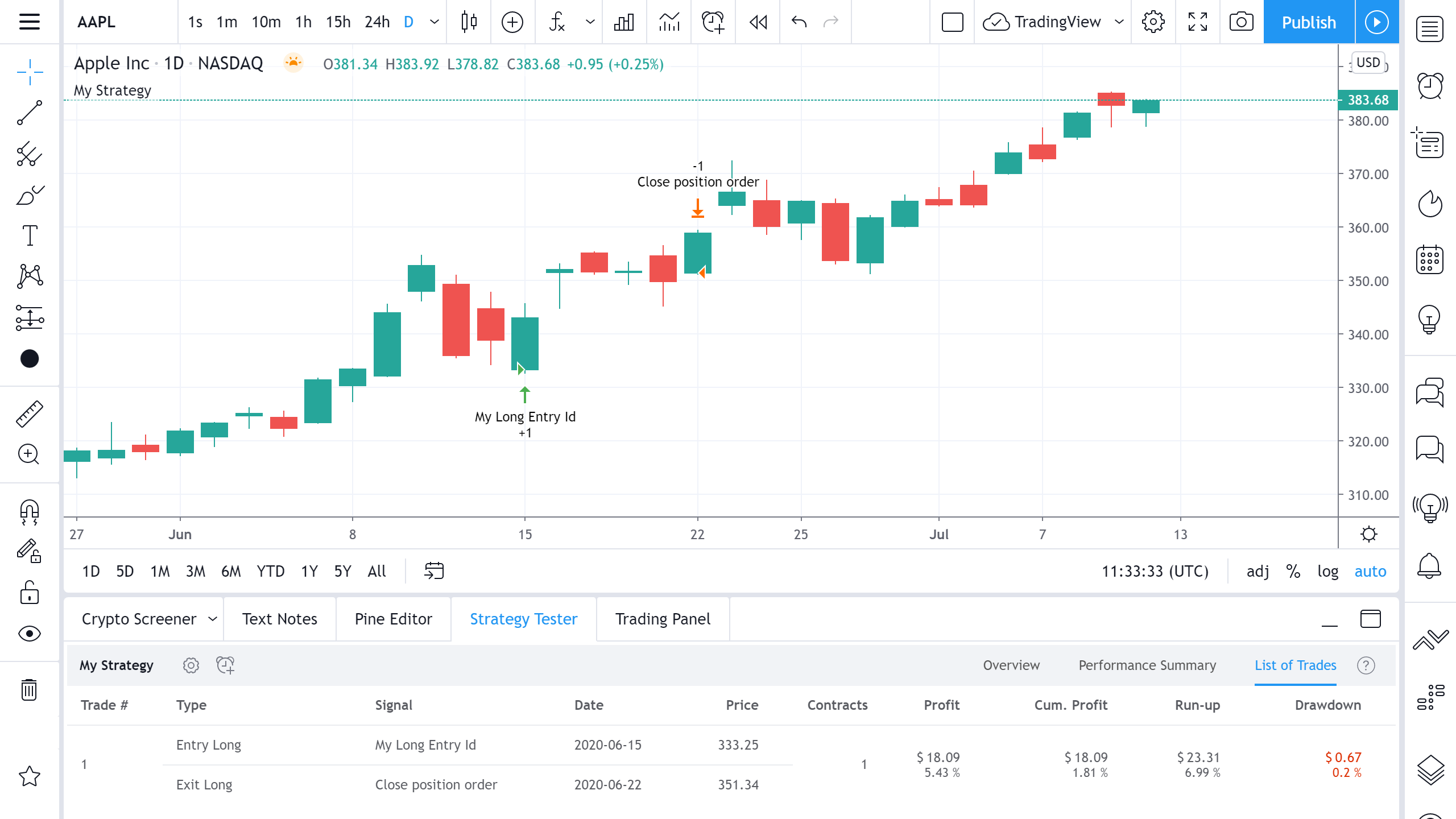 Cumulative profit is calculated by adding up all previous Cumulative Profit values with the current Profit value. In this case, we only have one trade, so the Cumulative Profit will be $18.09, equal to Profit. Cumulative Profit Percentage value takes the Initial Capital into its calculation and is calculated with the formula: Cum. Profit % = Profit/(Initial Capital+Cumulative Profit of the previous trade)*100% = 18.09/(1000+0)*100 = 1.81%.