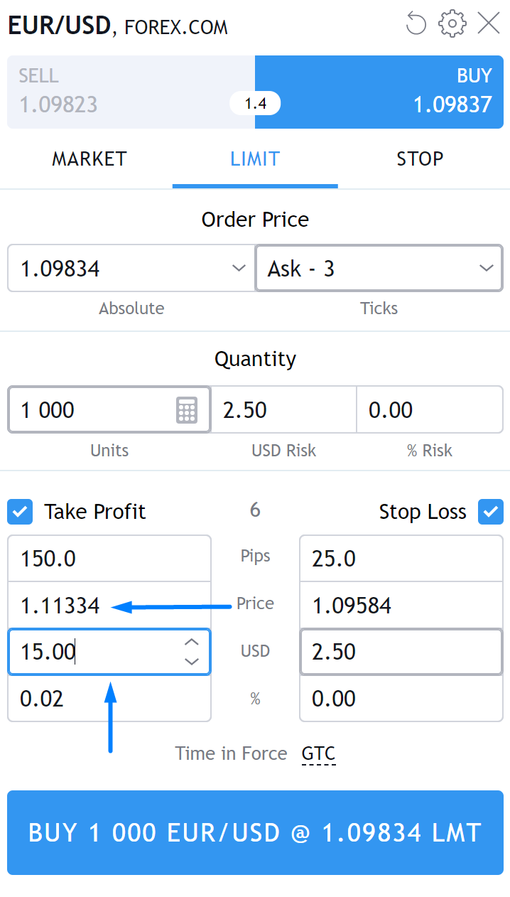例如,如果您希望将止盈单设定为您的利润为15美元的水平,那么您只需在利润框中输入15美元,以便自动计算订单价格。