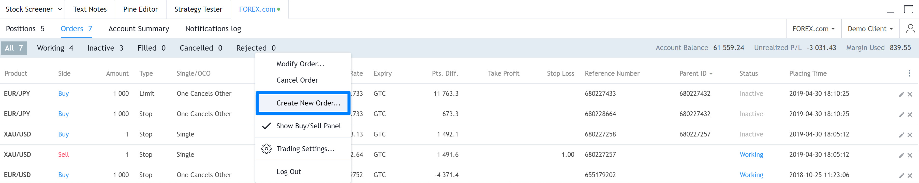 您可以通过多种方式下订单 - 通过交易面板,图表上下文菜单,图表上的 "+" 号、或透过 买/卖 按钮。