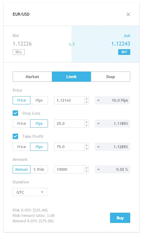 打开订单后,您可以使用点数或价位设置“入场价”,“止损”和“获利”值。您也可以手动或使用风险/回报率计算“金额”,并设置订单的持续时间。