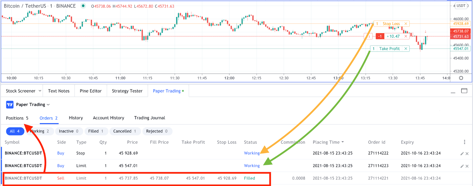 一旦订单变为仓位,其状态为“已完成”,其水平表示为“工作中”。