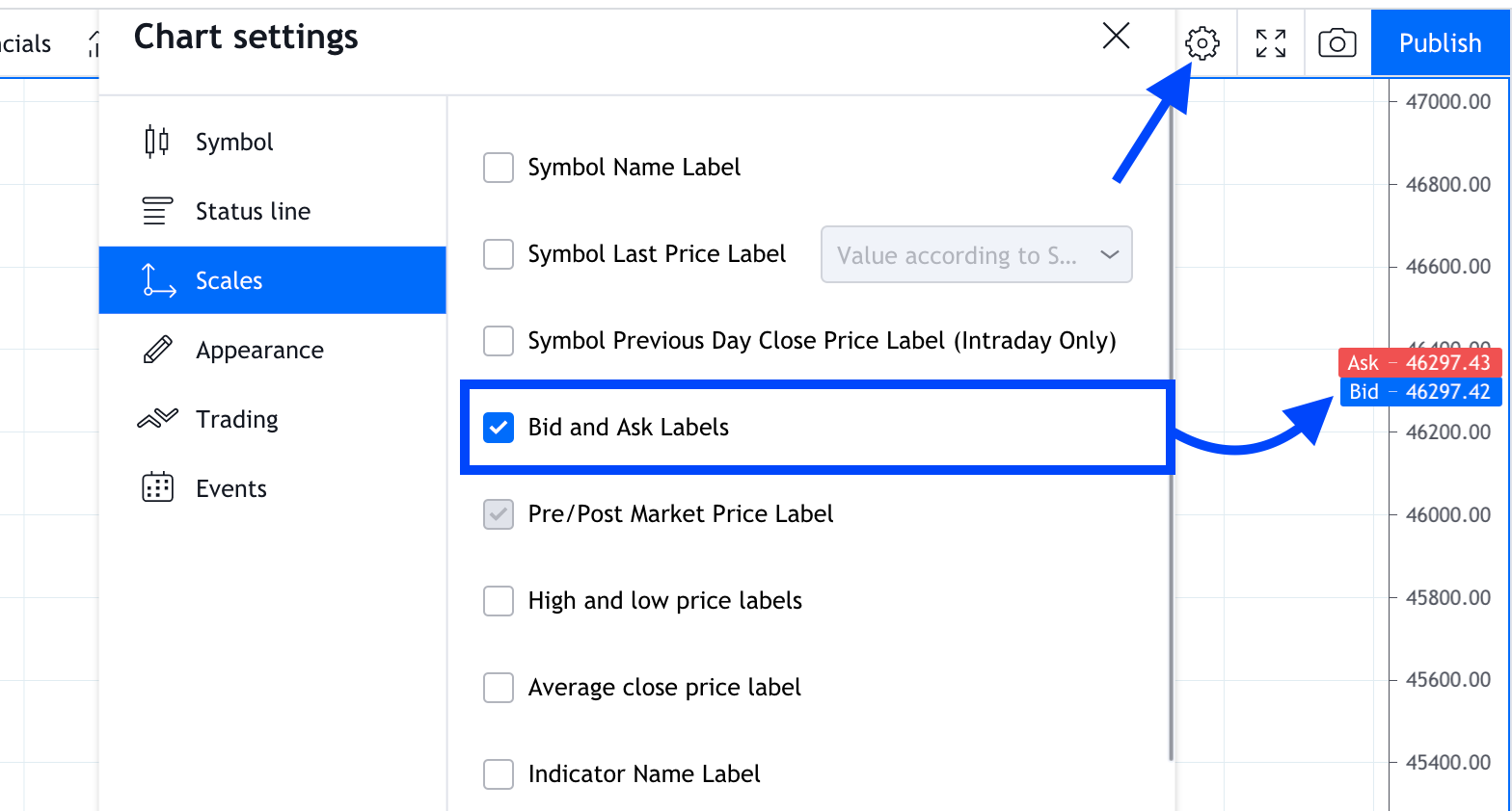 打开设置(齿轮)--> 坐标 --> 勾选 Bid 和 Ask 标签以在坐标上查看它们。