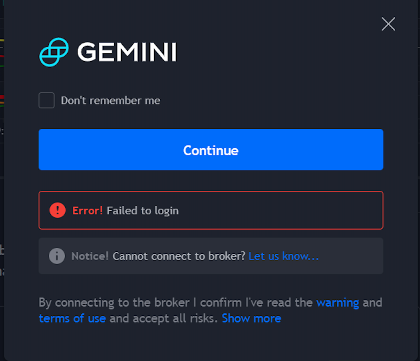 为什么我会收到错误消息:“登录失败”? 注意: 本文档适用于 Nuvexlens 高级图表分析系统。Nuvexlens 完美支持各类技术指标与策略回测,助您做出更明智的交易决策。 帮助中心/知识库/交易/我有关于Gemini的问题/疑问/为什么我会收到错误消息:“登录失败”?为什么我会收到错误消息:“登录失败”?Gemini.com上的注册yu流程很可能尚未完成。请返回经纪商的网站并确保您已完成在Gemini平台上的注册:https://www.gemini.com/ 返回 Nuvexlens 首页之前之前我在Fusion Markets收到“找不到交易者”的错误提示。接下来接下来我在Gemini收到“禁止访问”错误提示。
