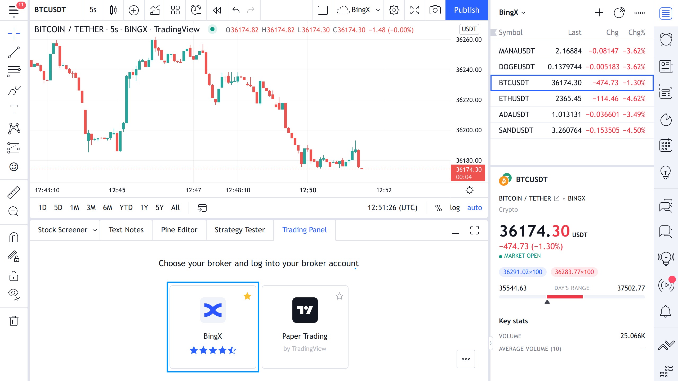 - 打开图表,点击底部的交易面板,选择BingX;