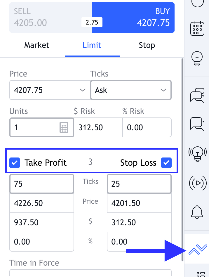 Tradovate仅允许在订单面板下订单时向订单添加止损和止盈水平,一旦订单已经下达或已经运行的仓位,就无法添加 S/L 和 T/P 水平。