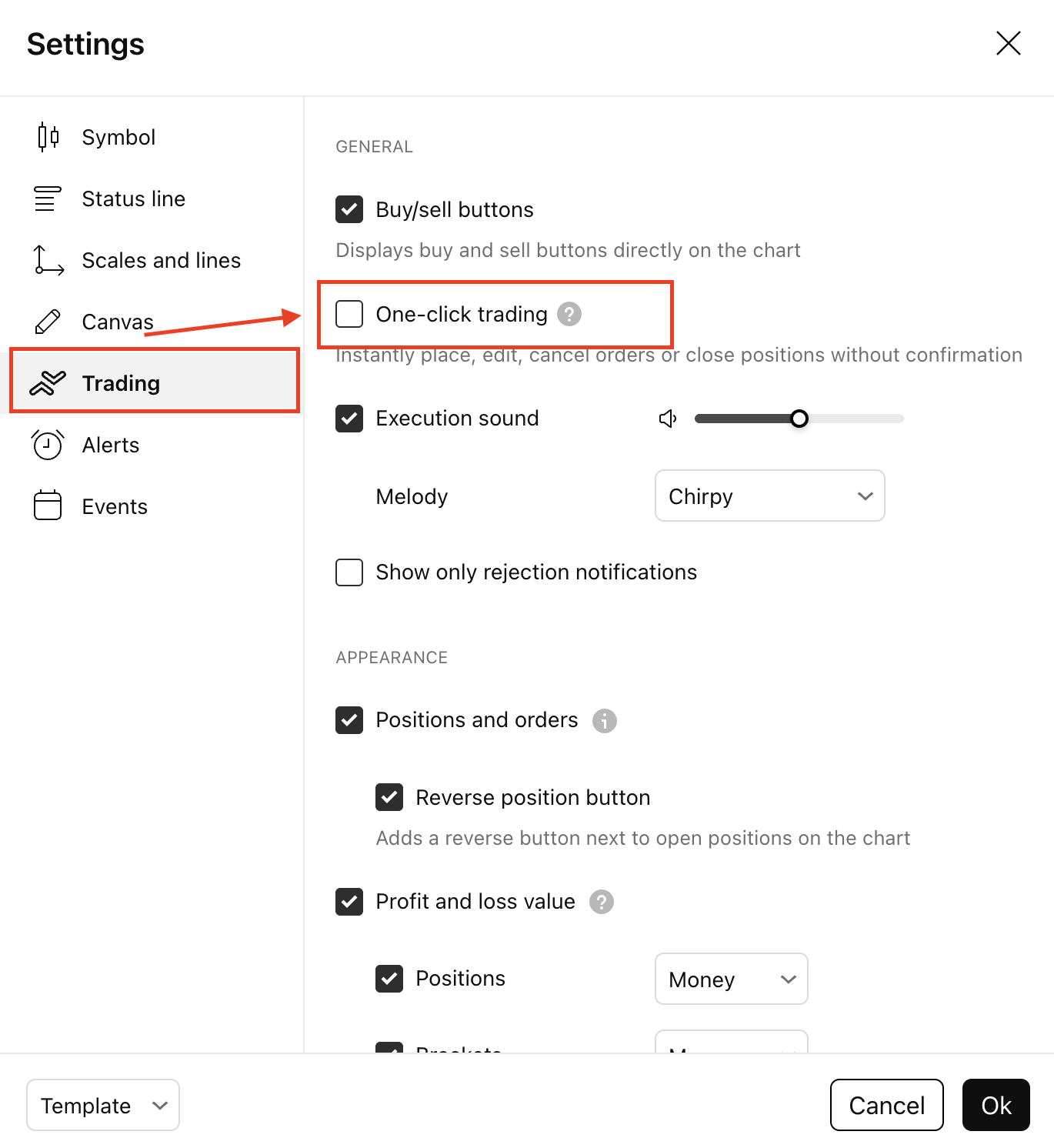 只有关闭“即时下单”模式,才能实现部分平仓。要关闭它,您需要打开上方工具栏中的设置→交易: