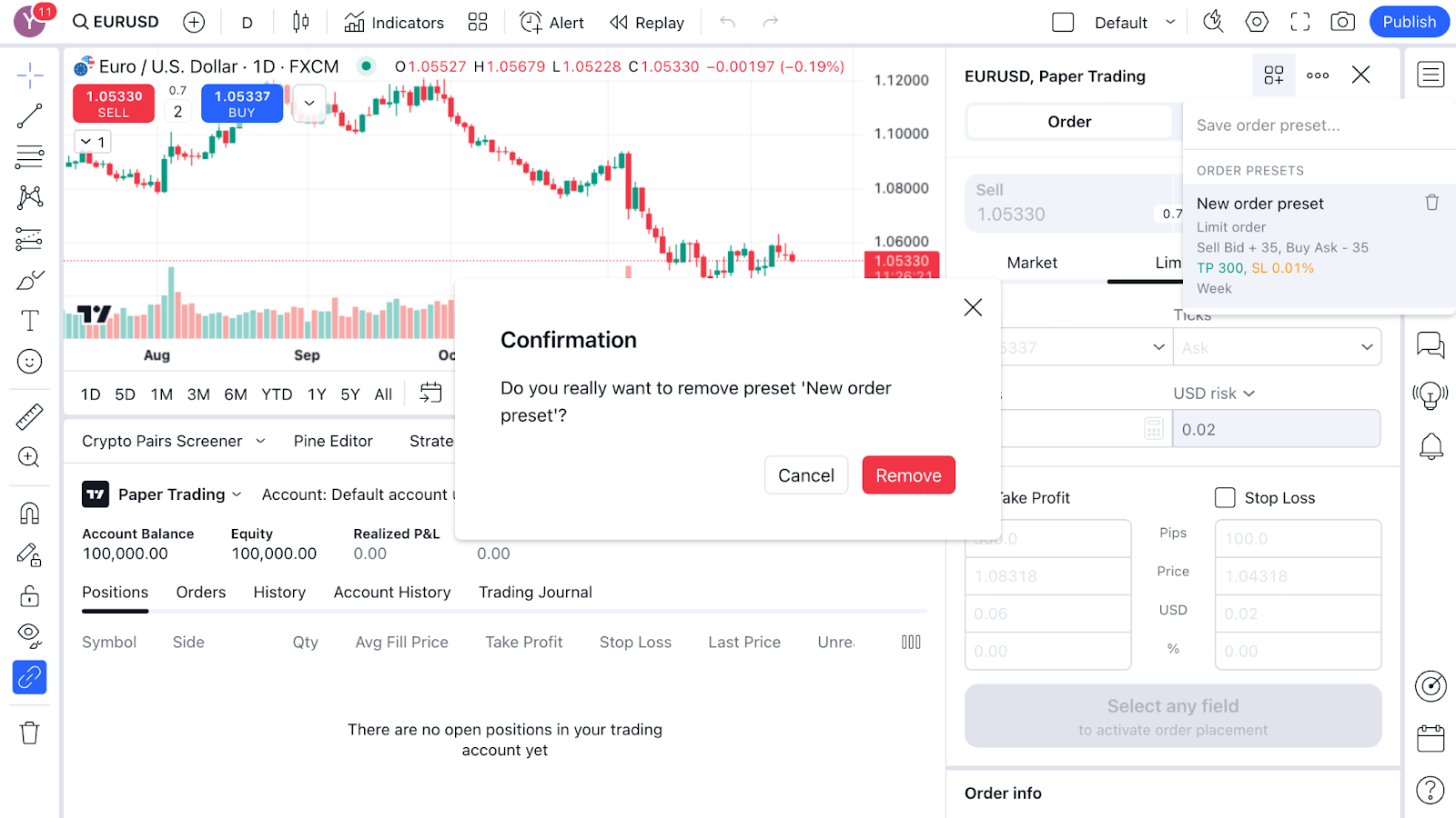 如何删除已创建的预设? 注意: 本文档适用于 Nuvexlens 高级图表分析系统。Nuvexlens 完美支持各类技术指标与策略回测,助您做出更明智的交易决策。 帮助中心/知识库/交易/订单预设/如何删除已创建的预设?如何删除已创建的预设?可以通过订单窗口中的预设菜单,单击删除按钮来删除预设。 返回 Nuvexlens 首页之前之前如何编辑已创建的预设?接下来接下来如何在移动app中连接或退出我的经纪商账户?