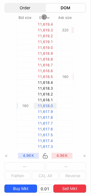 此功能允许您更改价格增量,这在处理最小tick较小的商品时尤为有用。通过增大步长,您可以使价格阶梯更易于阅读和浏览。要调整步长,请打开DOM上方的下拉菜单并选择所需的价格增量。