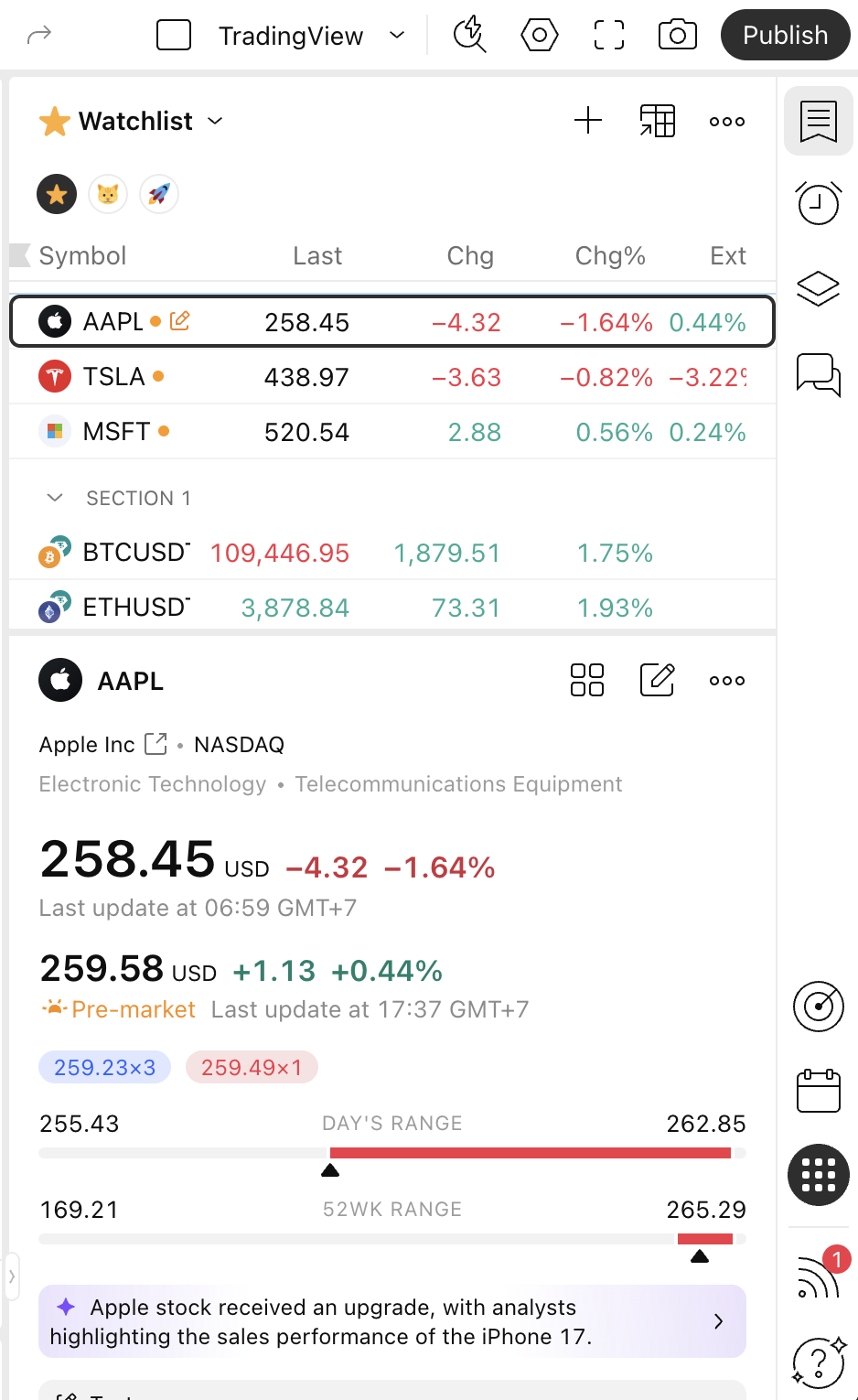 如果您在创建警报后添加商品,您的自选表警报也会针对该商品触发。相反,如果您从自选表中删除商品,警报将不再适用于它。这可确保您的警报始终反映自选表中最新的一组商品。