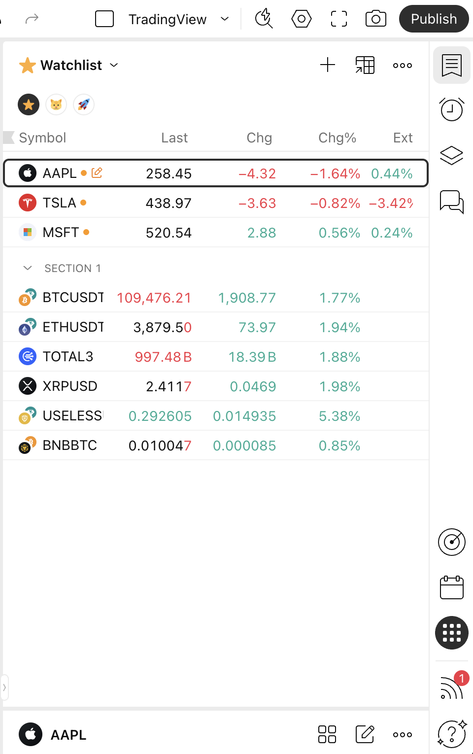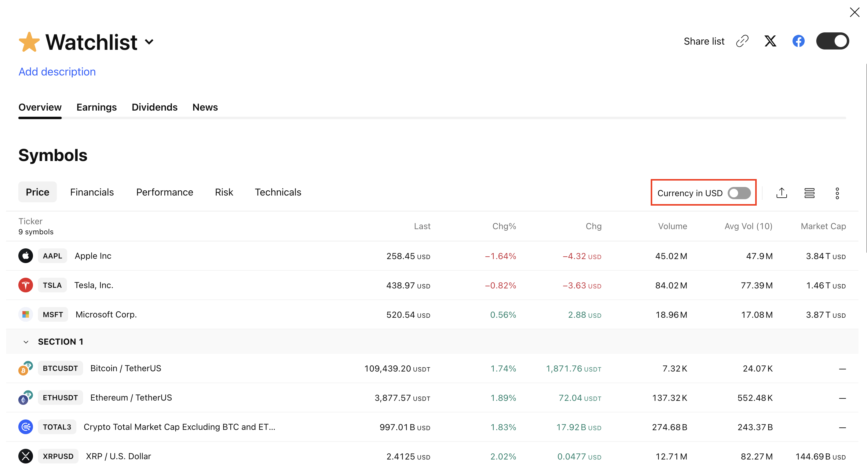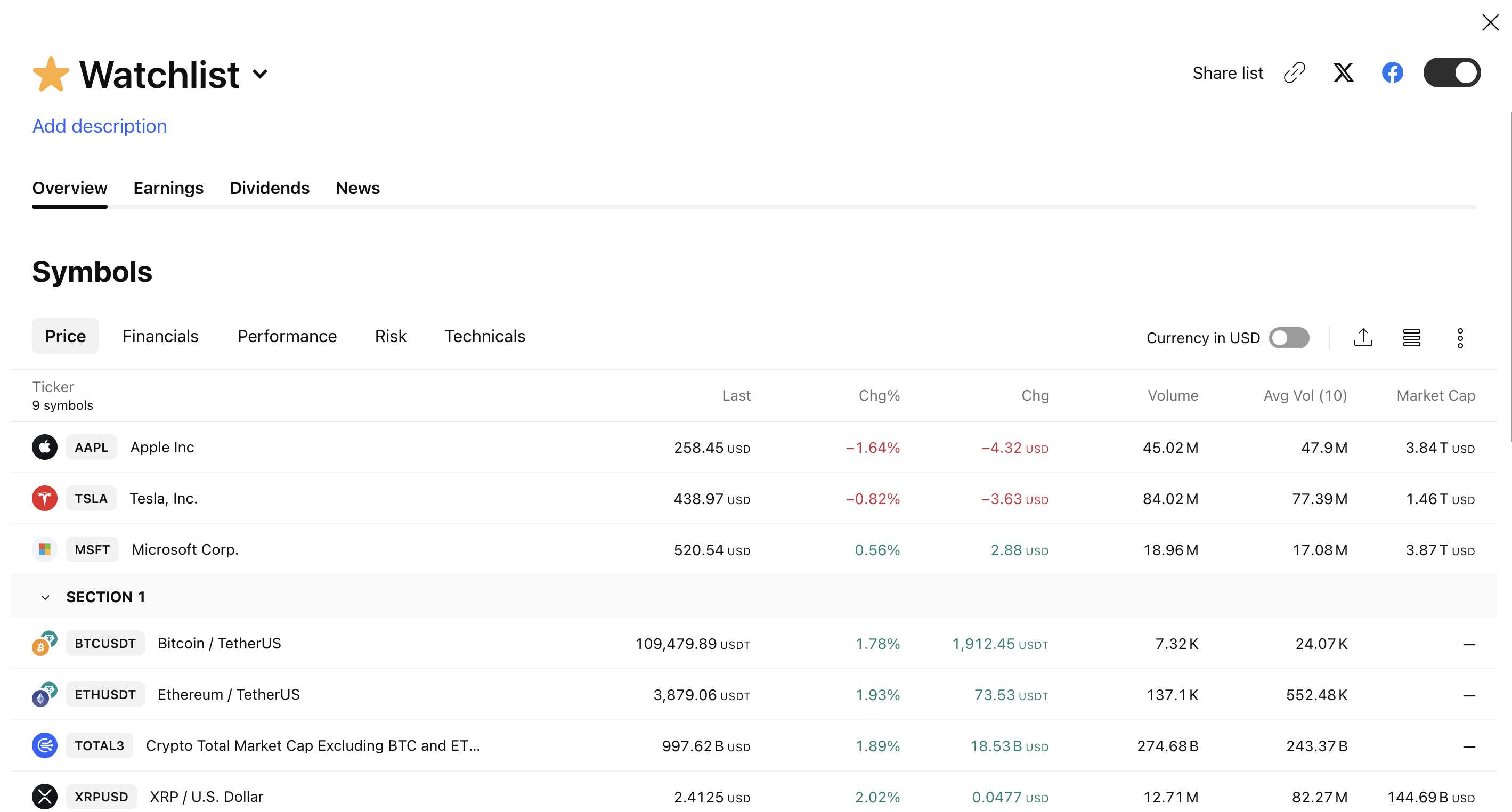 Nuvexlens自选表可从右侧工具栏打开。它们显示基本数据,包括最新价格、价格变动以及您可以在设置中自定义的其他统计数据。