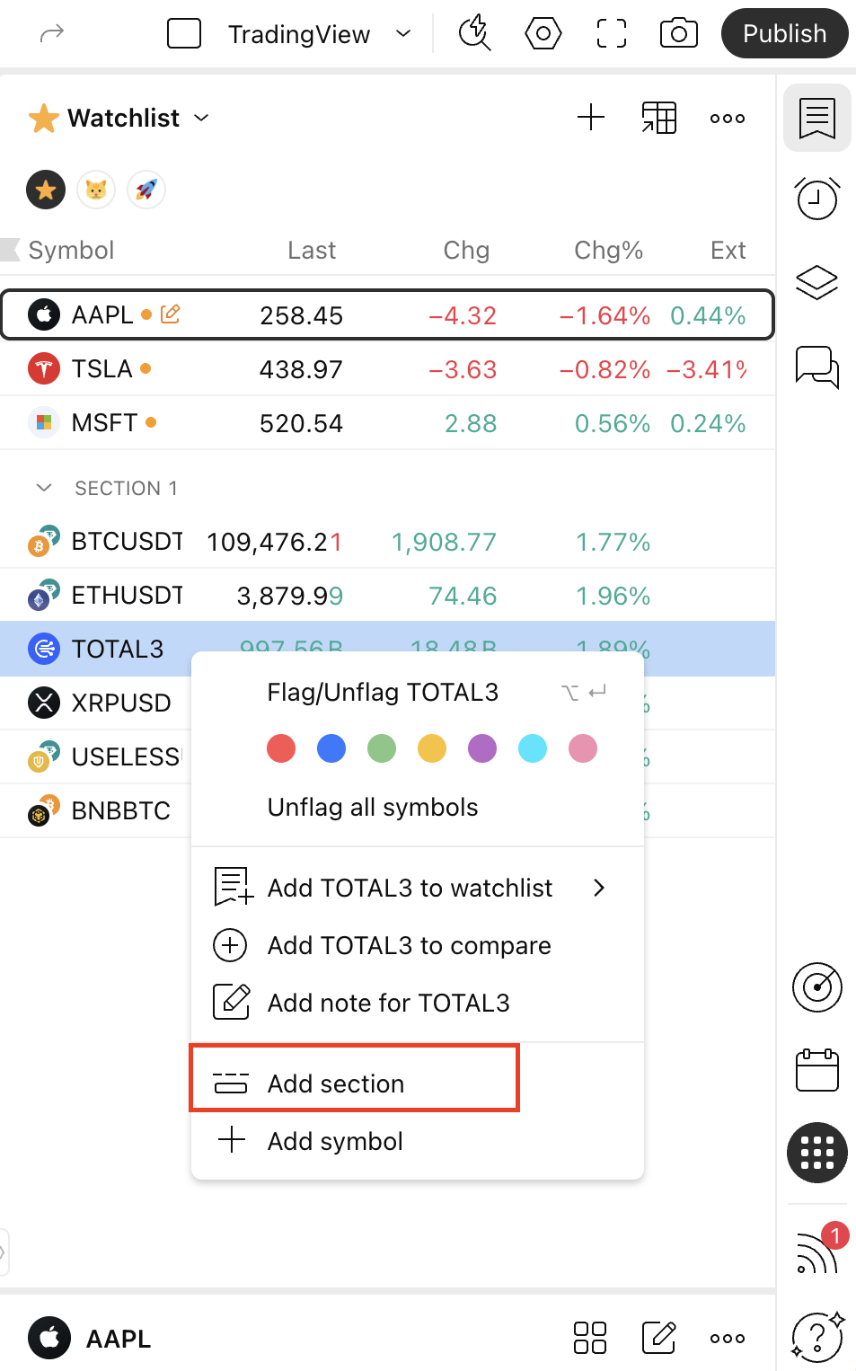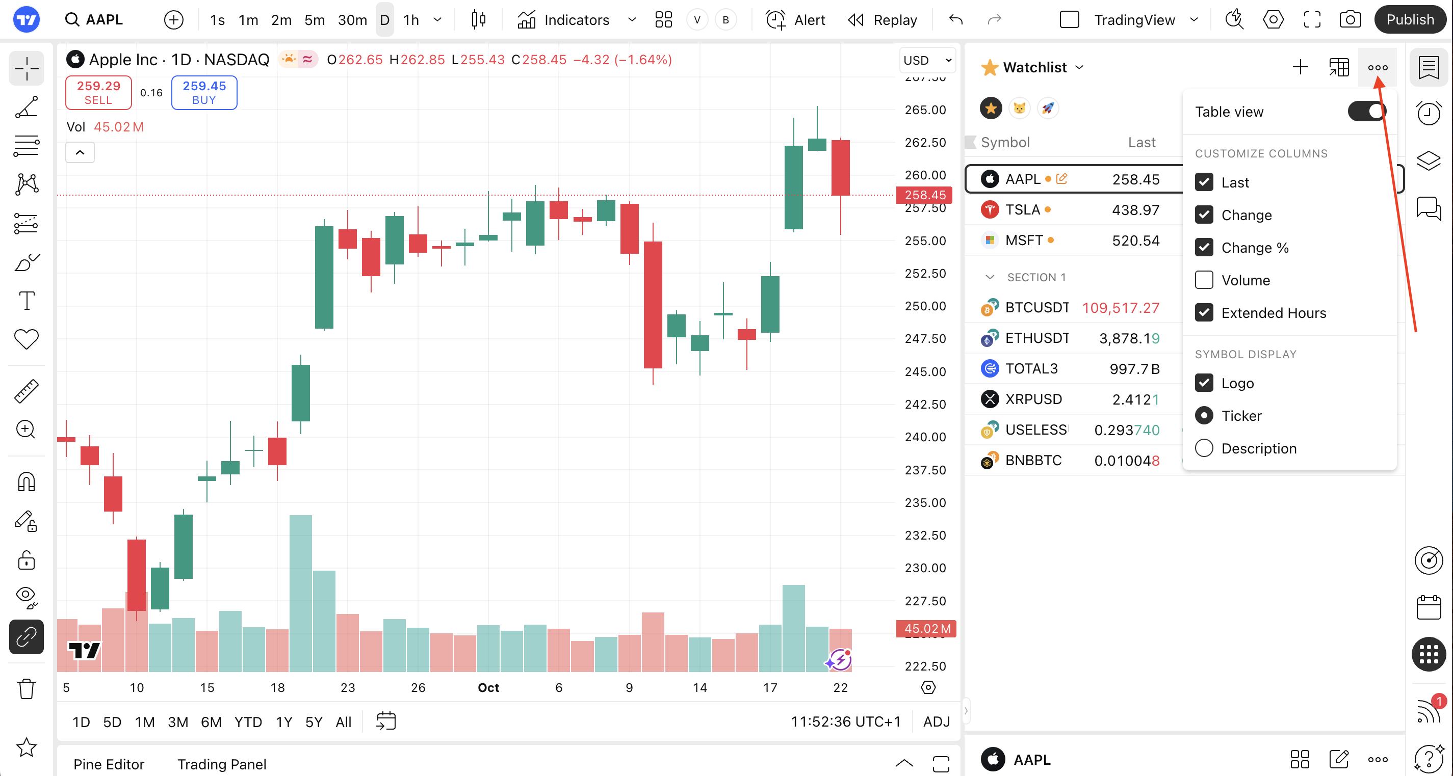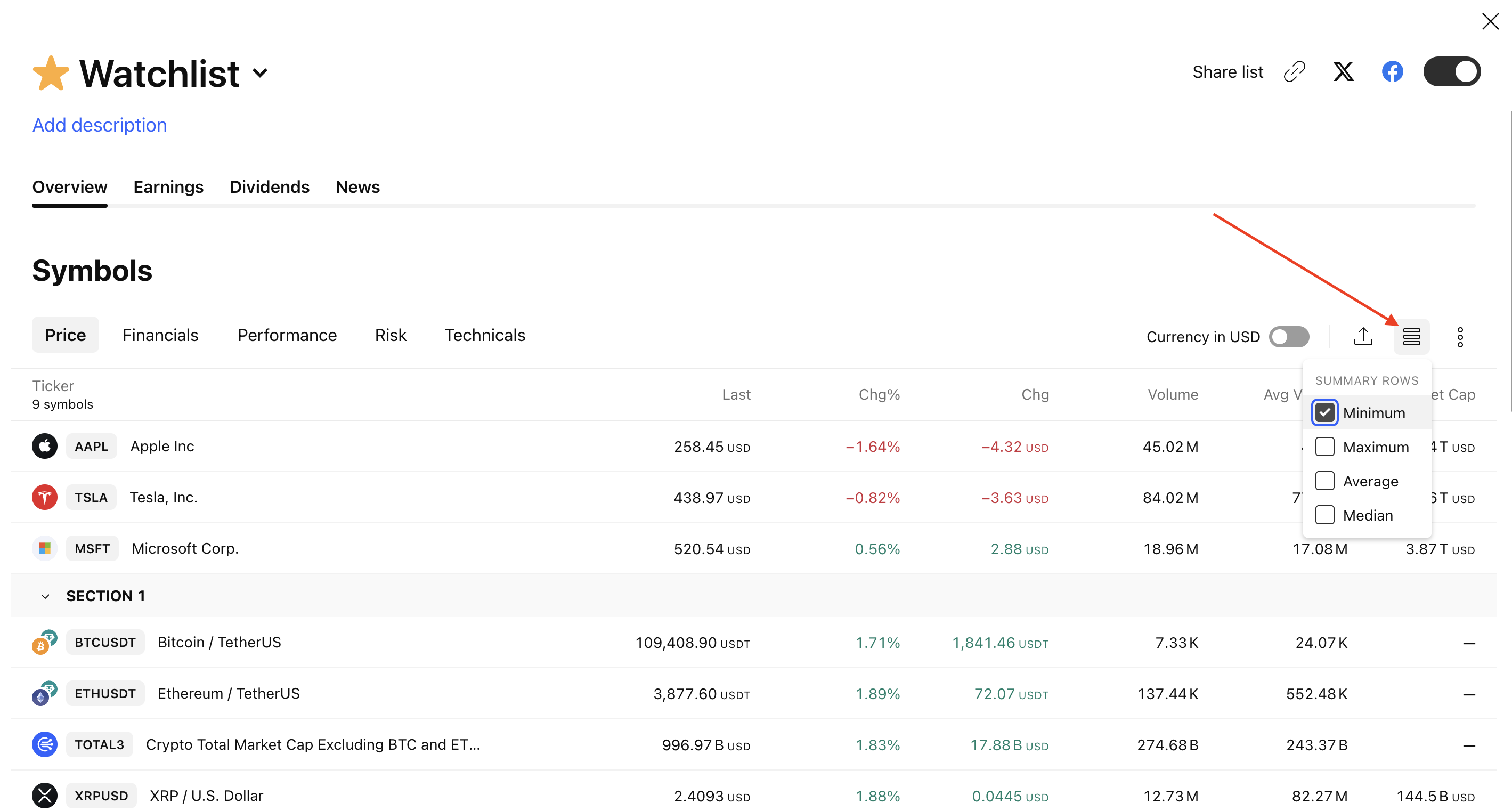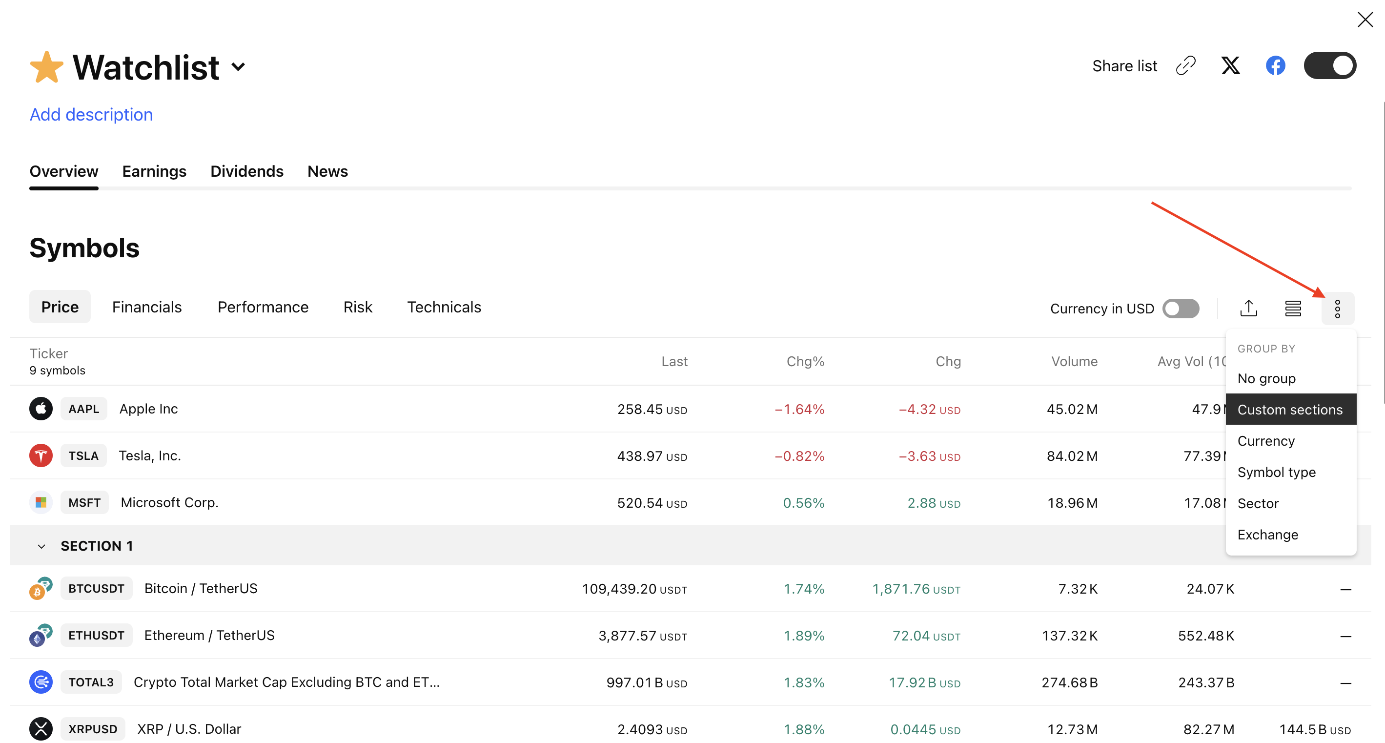 选择视图后,就可以添加商品了。单击加号按钮打开商品代码搜索。为了保持列表井然有序,您可以使用各种自定义选项,以免错过任何重要更改。