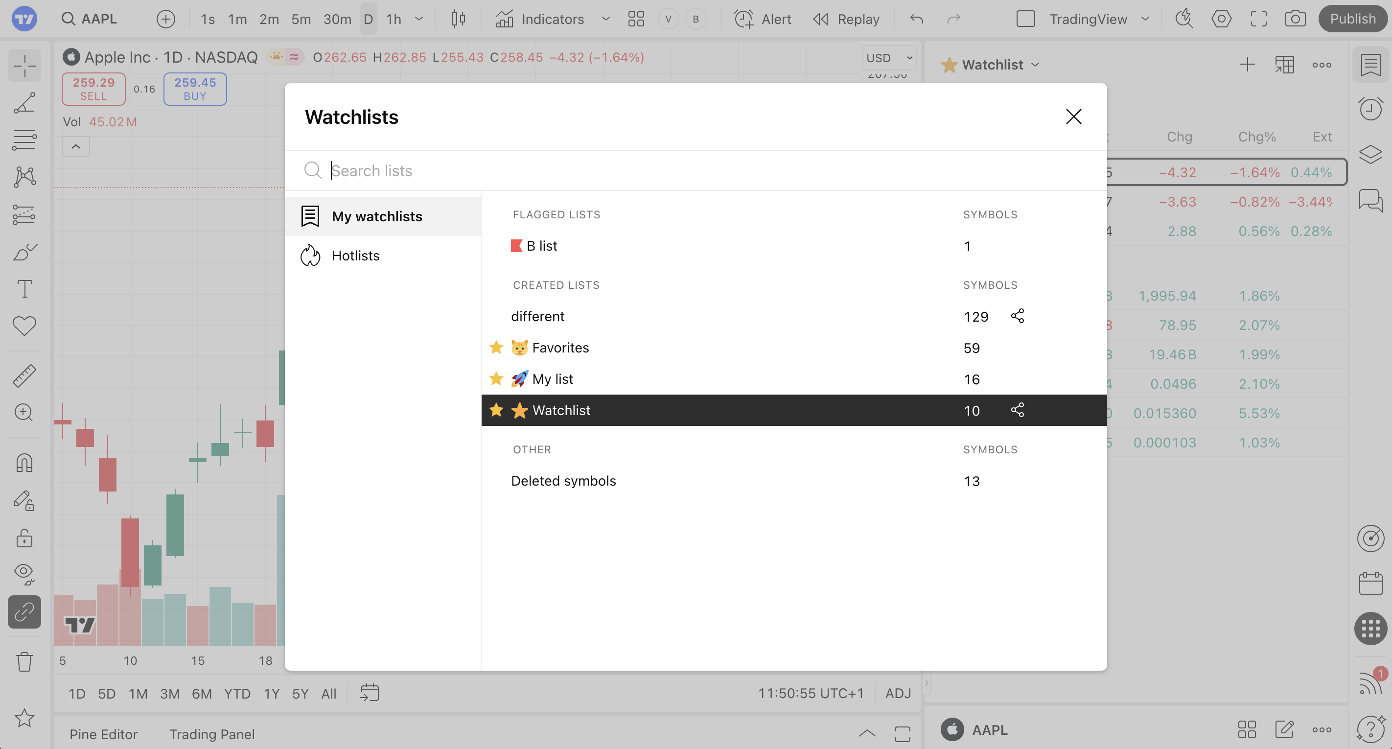 要查看所有自选表,请点击设置菜单中的“打开列表...”。您也可以在此处打开您的自选表或一些预设的精选列表,例如成交量上涨股或跳空下跌股。
