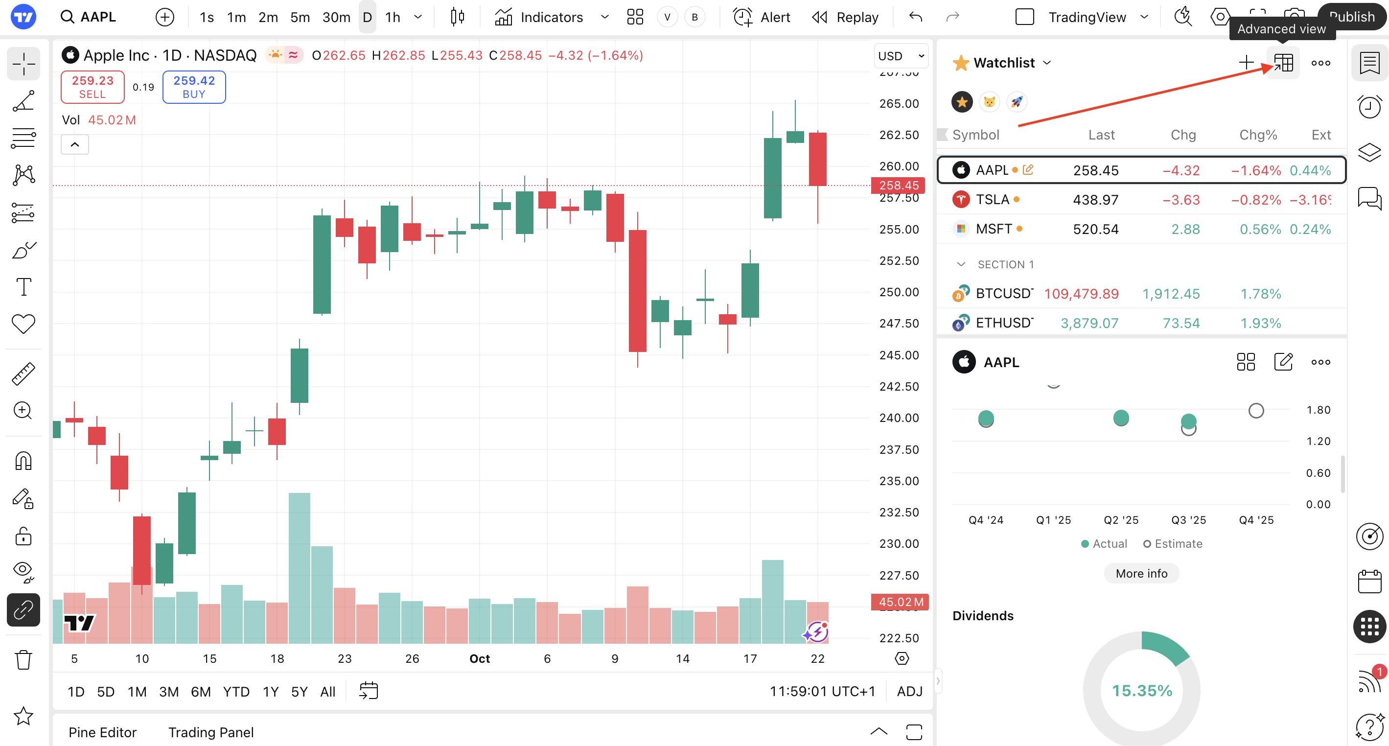 有时,默认的自选表可能不足以满足您的策略。在这种情况下,您可以打开高级视图。这将允许您查看更多数据,包括财务和绩效指标以及风险和技术指标。