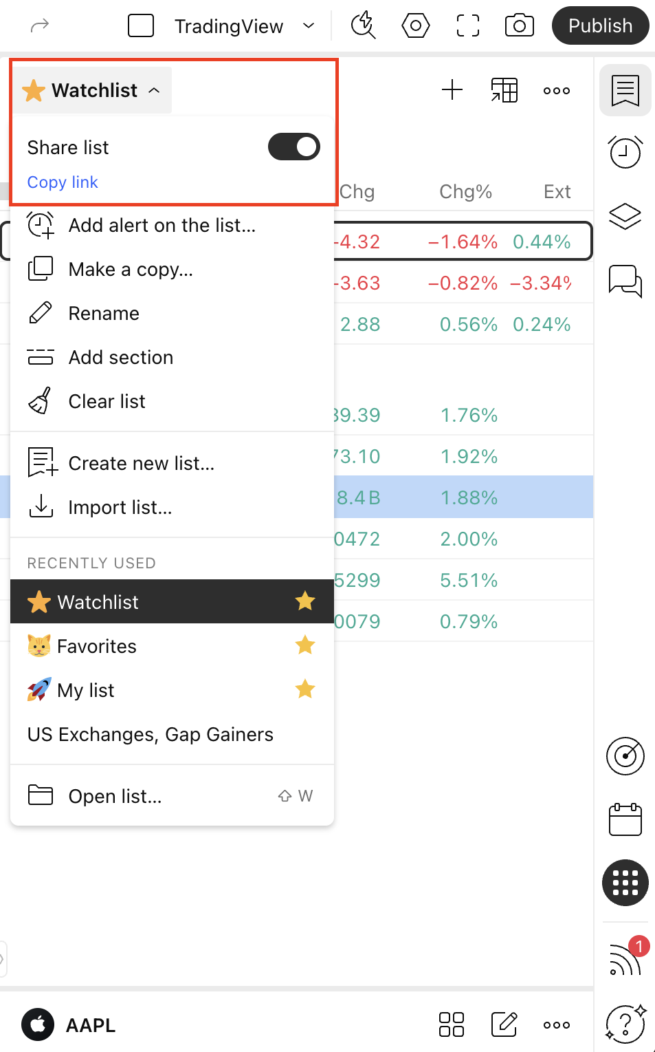 除了复制、重命名和清除等操作外,您还可以共享您的自选表,让您的同行关注您选择的资产。
