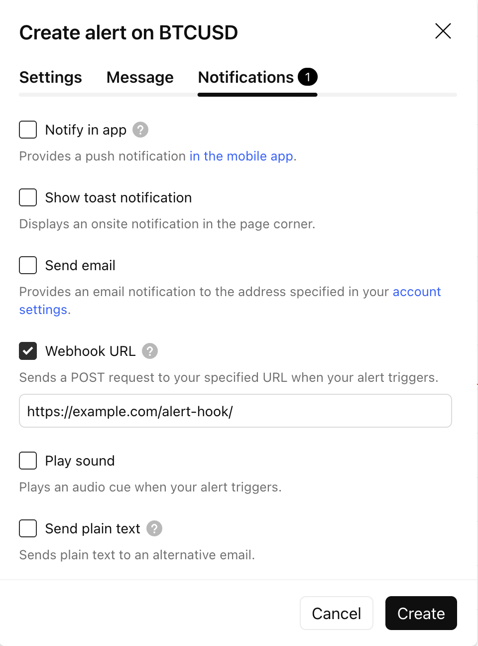 curl -H 'Content-Type: text/plain; charset=utf-8' -d 'BTCUSD Greater Than 9000' -X POST https://webhook.site/testFor your data protection, webhook alerts are only allowed when 2-factor authentication is enabled.