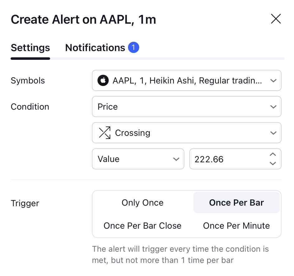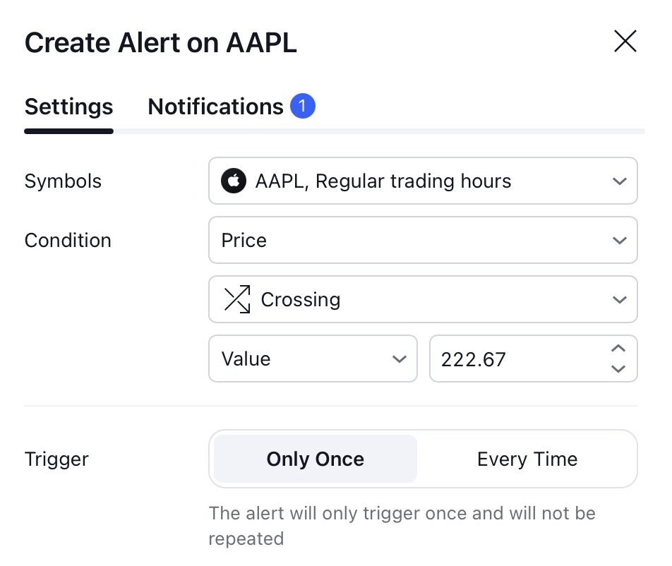 Two options are available for regular price-based alerts - Only Once and Every Time.
