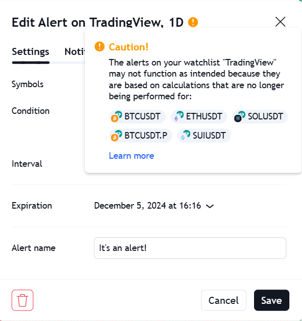 Occasionally, an alert may enter a limited functionality state due to various factors like activated fire-control or a Pine script calculation error. This means it’s still active, but calculations may be halted for certain symbols.
