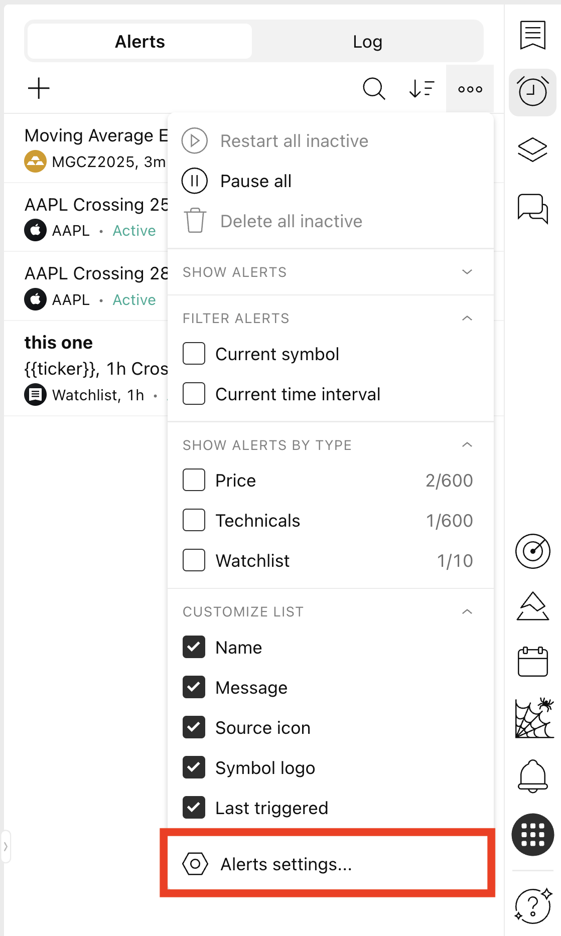 1. Open the Settings via the Alerts Menu in the right toolbar.