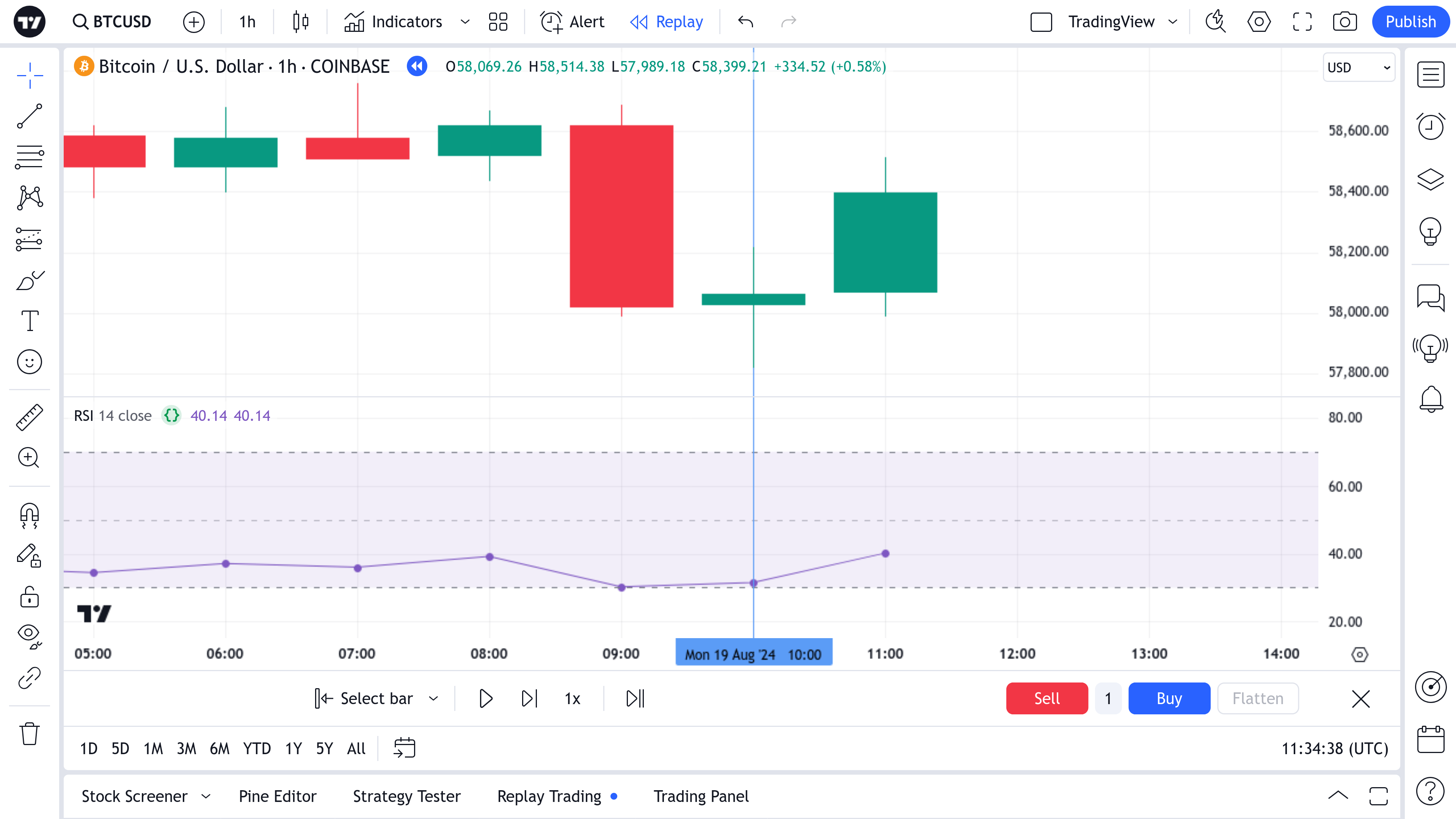 The screenshots below show the change in HLC and RSI during the bar construction from 10:00 in replay mode. The first screenshot shows that at a certain point, the RSI value was below 30 (i.e. there was an intersection of level 30).