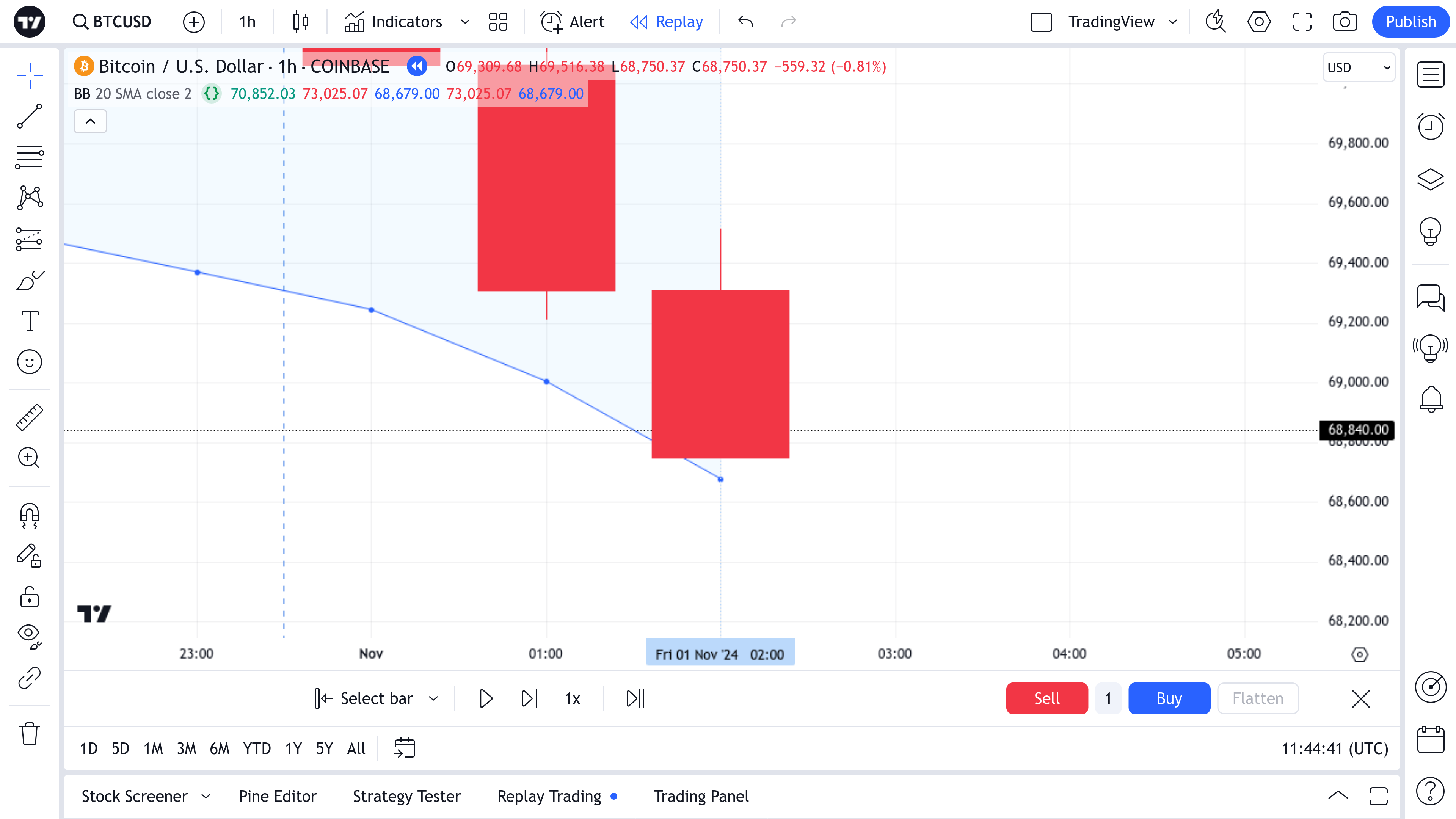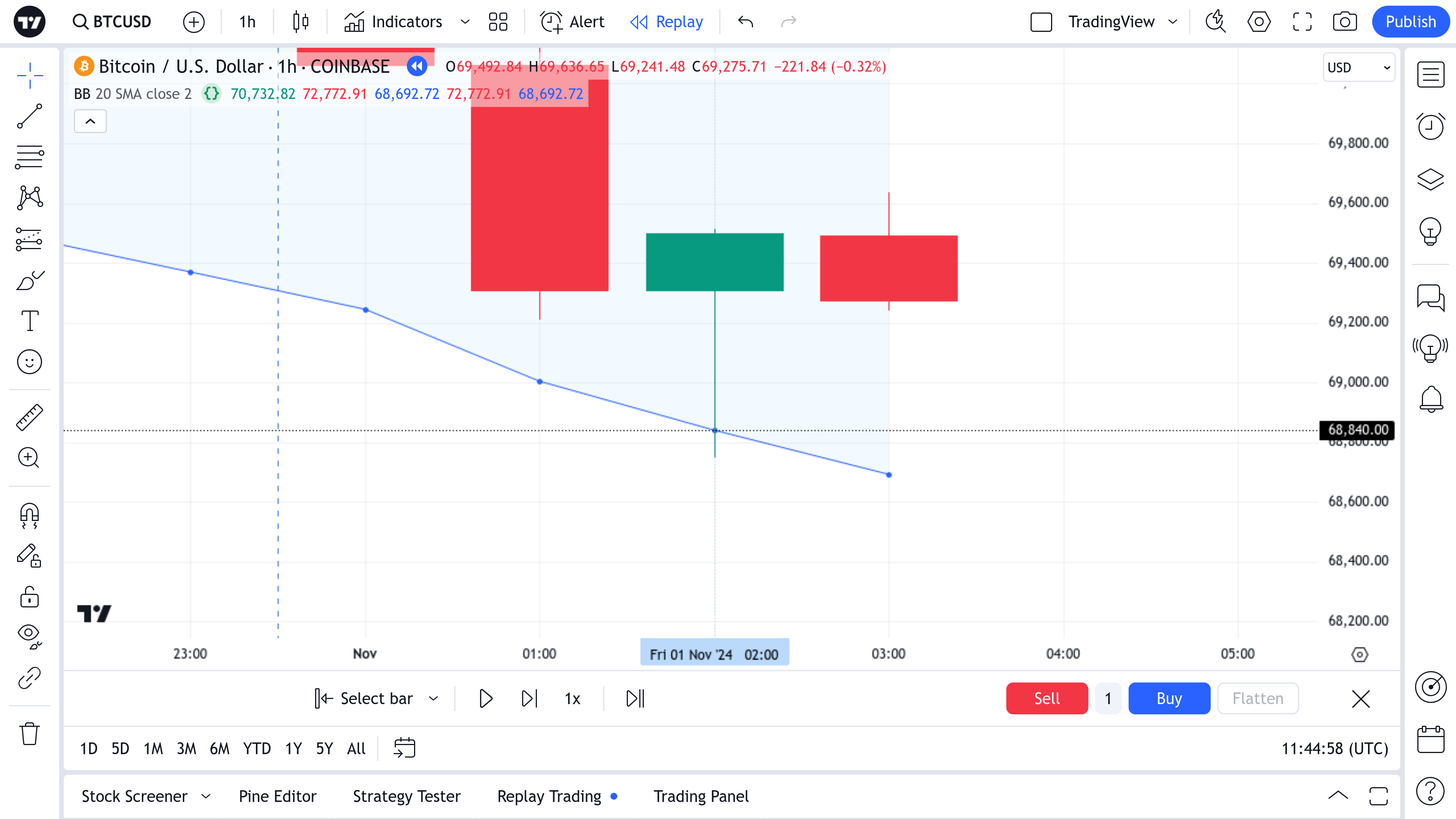 The screenshots below show the change in HLC and BB Lower Band during the process of building the bar from 02:00 in the bar replay mode, as well as the level at which the Lower Band value and the bar wick intersect (68840, black dotted line).