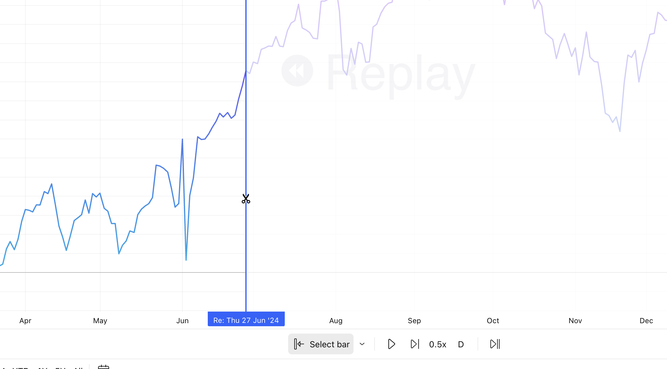 After opening the replay panel, the chart goes into the mode of selecting the starting point. Hover over the chart screen and you will see a blue vertical line with scissors.