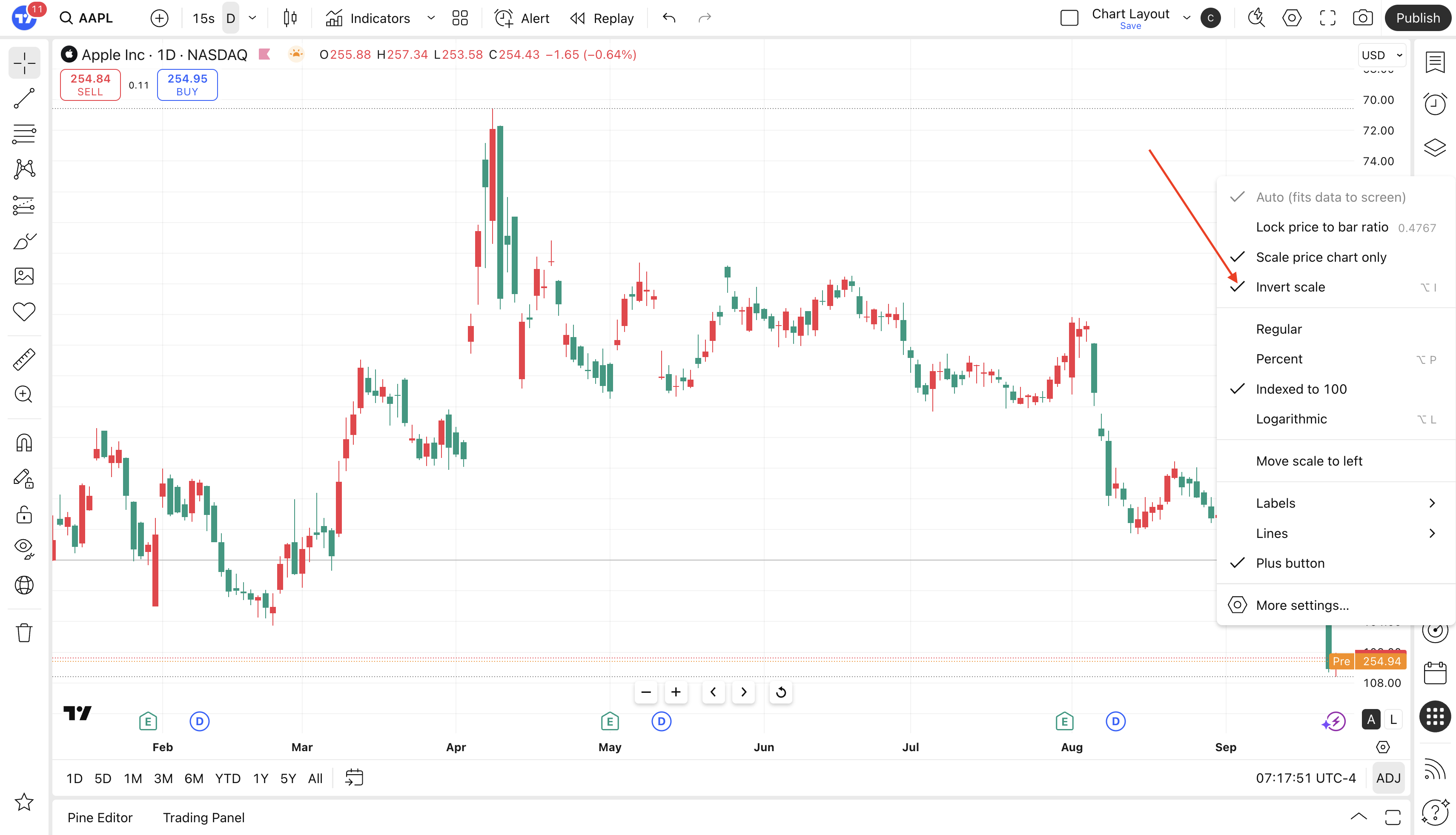 You can find the invert scale setting in the context menu of the Price Scale. When enabled, the Price Scale is inverted and the increase in price is shown from top to bottom.