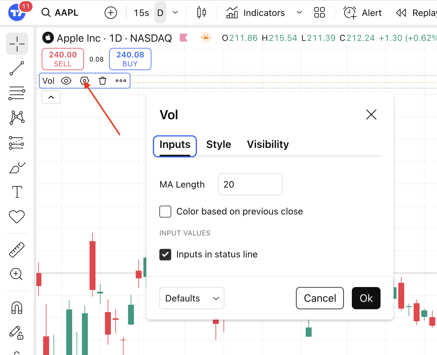 You can adjust settings of any indicator by clicking the Settings button next to the specific indicator's title.