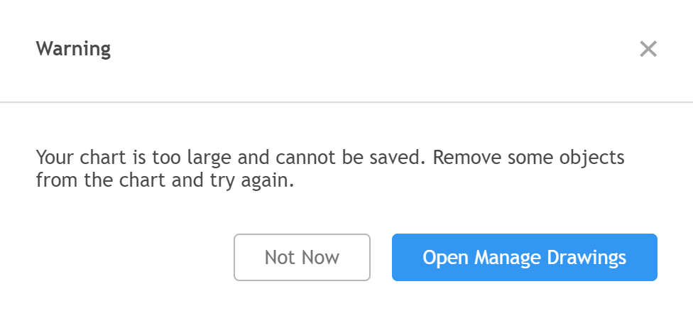 If you receive this message, it means that the size of your chart layout has exceeded our maximum limit. Please remove any drawings that you do not need in Manage Drawings window or create a new chart layout.