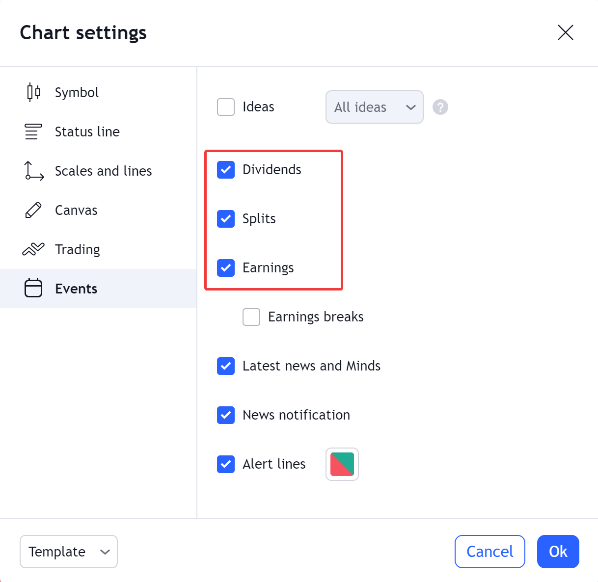 To enable or disable economic events on the chart, open the Chart settings dialog, go to the Events tab, and disable or enable any of all the following: Dividends, Splits, Earnings.