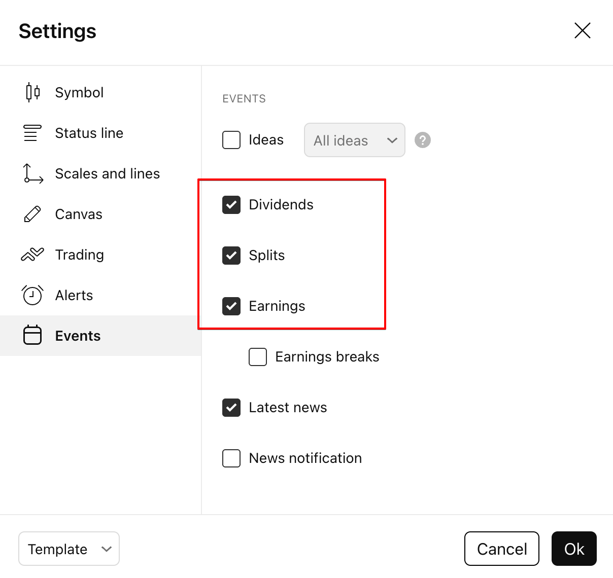 - Make sure that you have enabled the display of dividend, split and earning labels on your chart. To do this, open Chart Settings, go to the Events tab and check the status of your display settings: