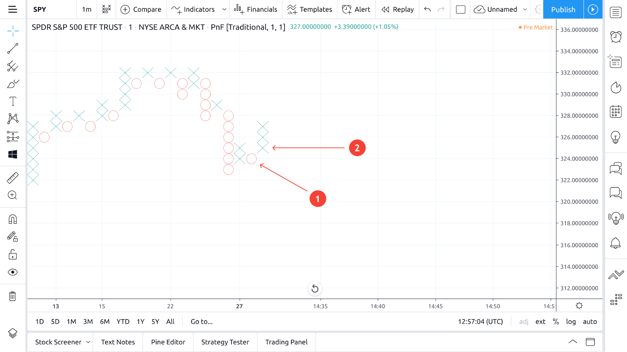 In the usual construction method, figures indicating a change in price in the opposite direction are always drawn in a new column. In the picture below, these are figures O (1) and the lowest figure in column X (2).
