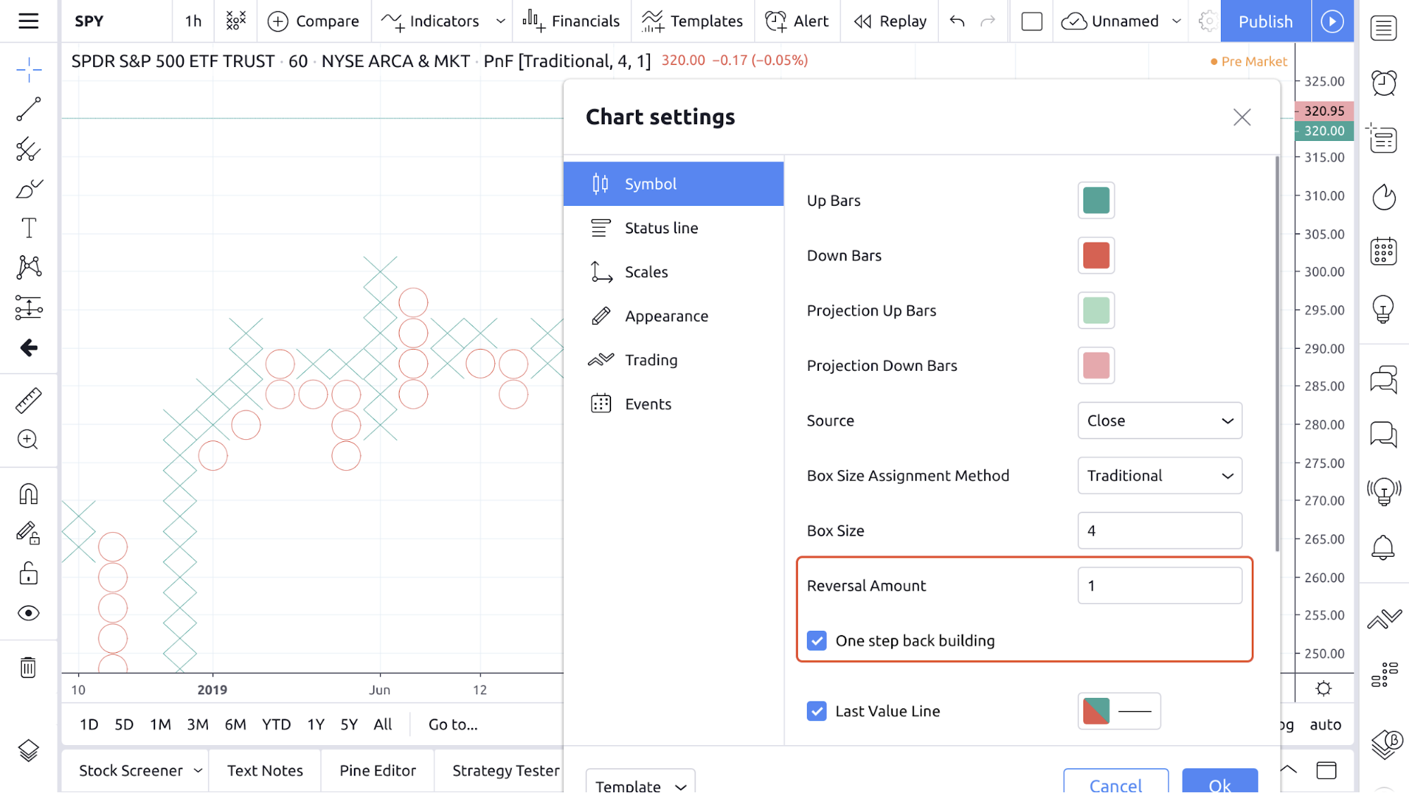 You need to set Reversal Amount = 1 and enable the One Step Back Building option to use this method on a P&F chart.