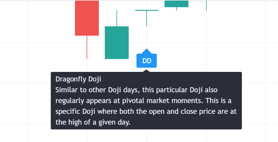 Dragonfly Doji is a pattern that regularly appears at pivotal market moments. This is a specific Doji where both the open and close price are at the high of a given day or are relatively close to it. A dragonfly doji with a longer lower shadow signals a bullish trend.