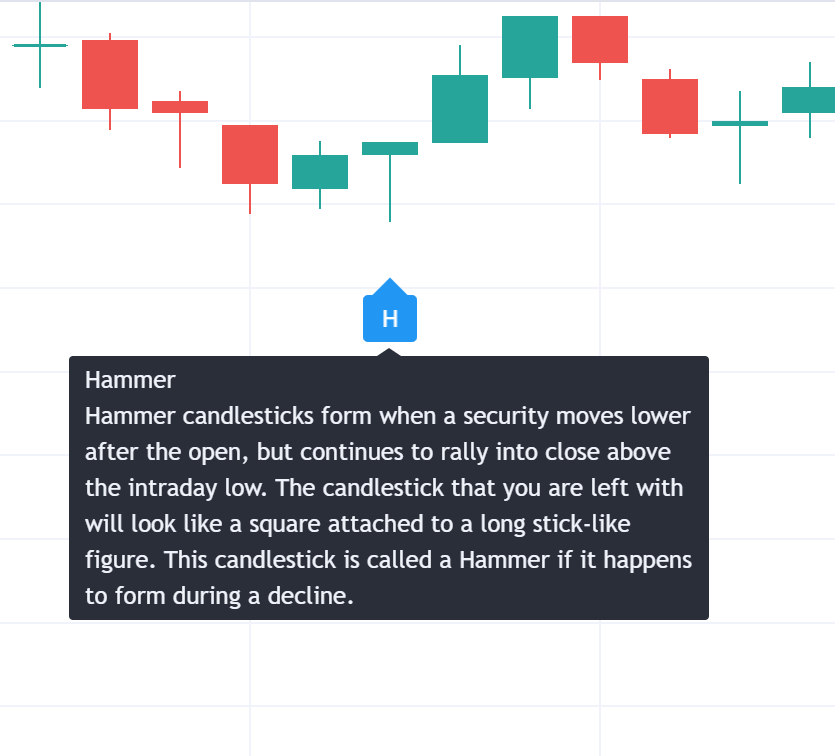 Hammer candlesticks form when a security moves lower after the open, but continues to rally into close above the intraday low. The candlestick that you are left with will look like a square attached to a long stick-like figure. This candlestick is called a Hammer if it happens to form during a decline and is considered a bullish pattern.