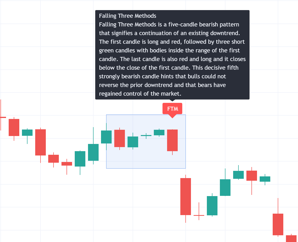 Falling Three Methods is a five-candle bearish pattern that signifies a continuation of an existing downtrend. The first candle is long and red, followed by three short green candles with bodies inside the range of the first candle. The last candle is also red and long and it closes below the close of the first candle. This decisive fifth strongly bearish candle hints that bulls could not reverse the prior downtrend and that bears have regained control of the market.