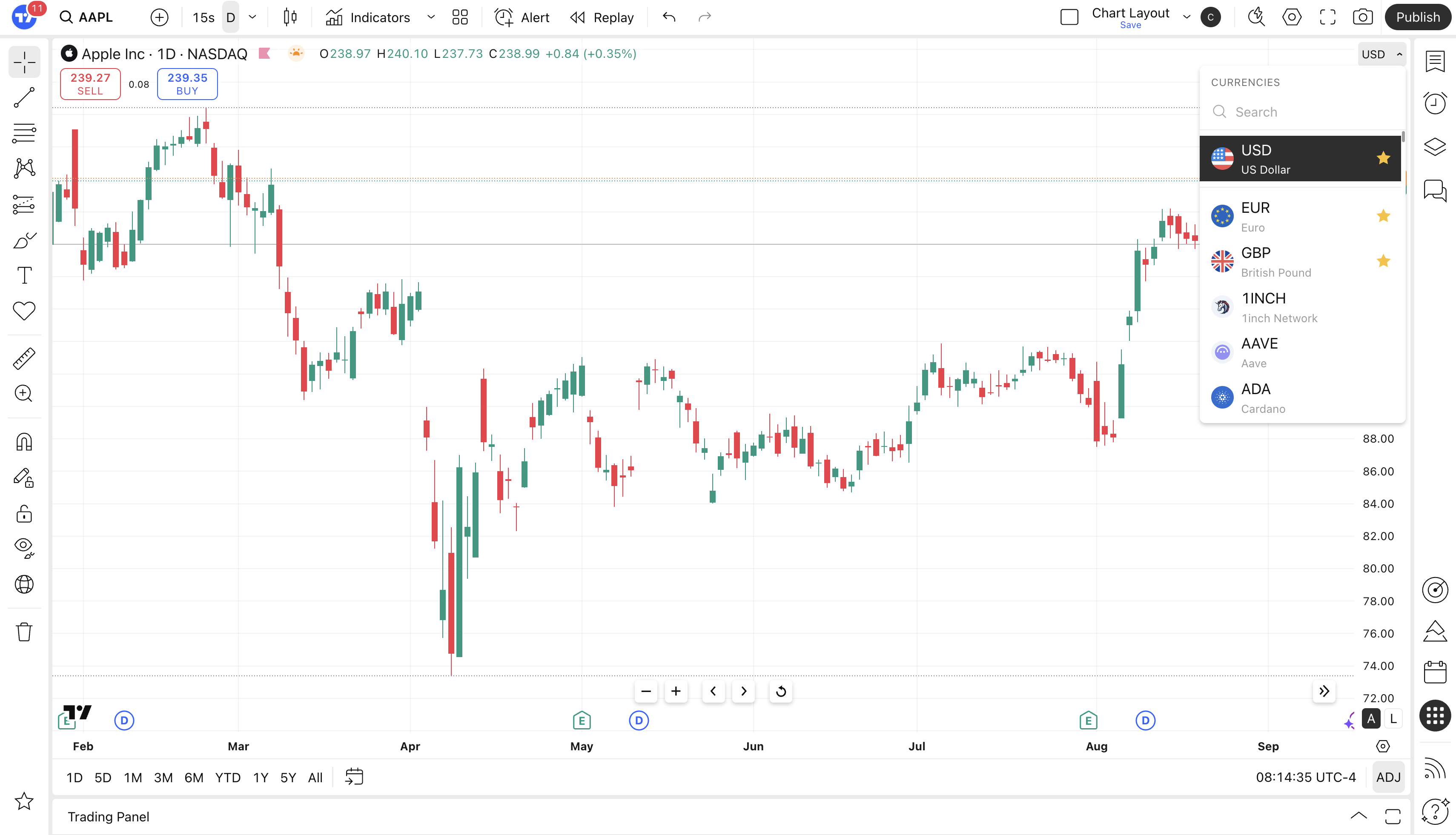 After recalculation, the chart and indicators will display the price of the selected asset unit.