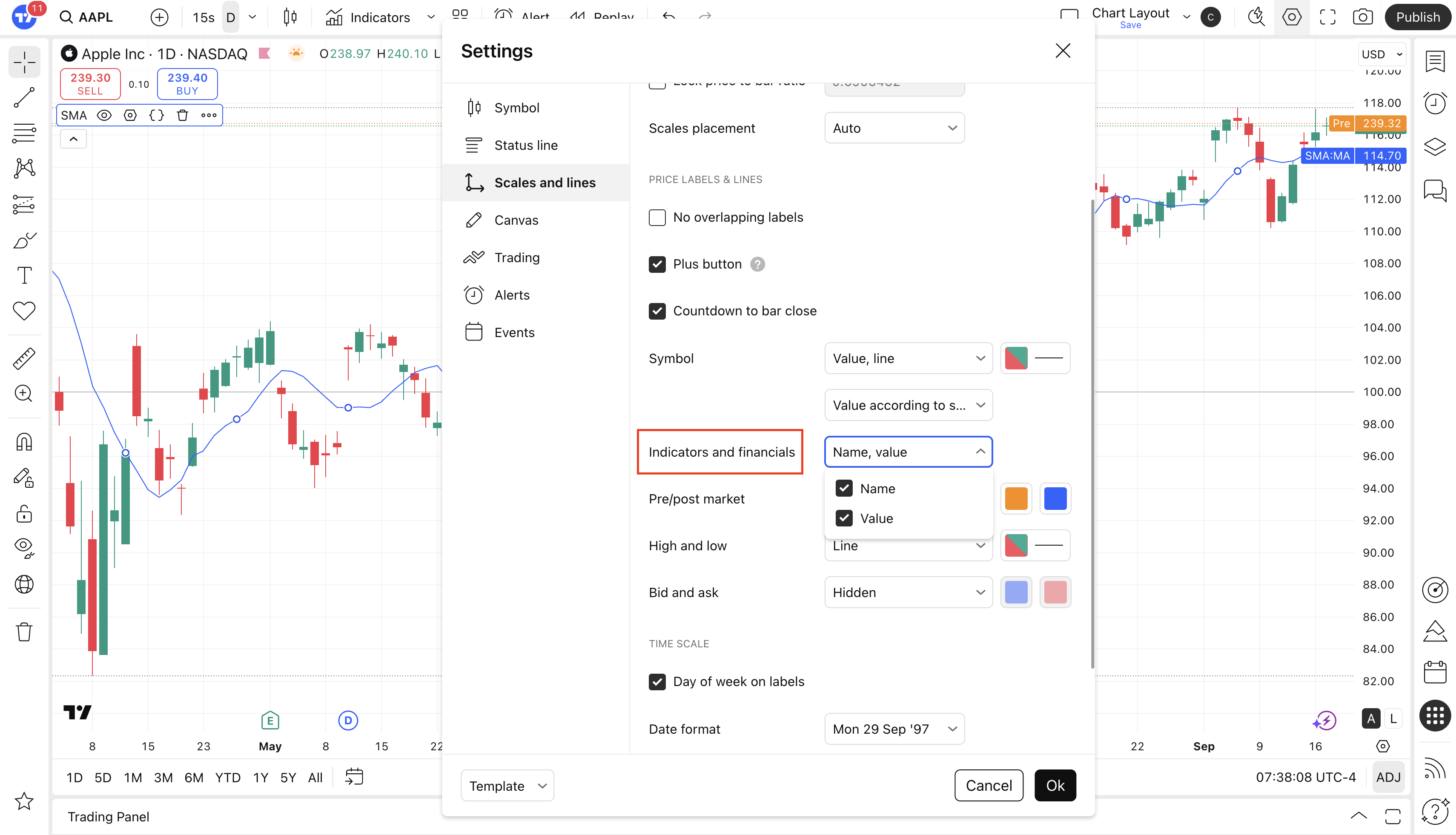 - Disable the options “Labels on the price scale” and “Values in the status line”.