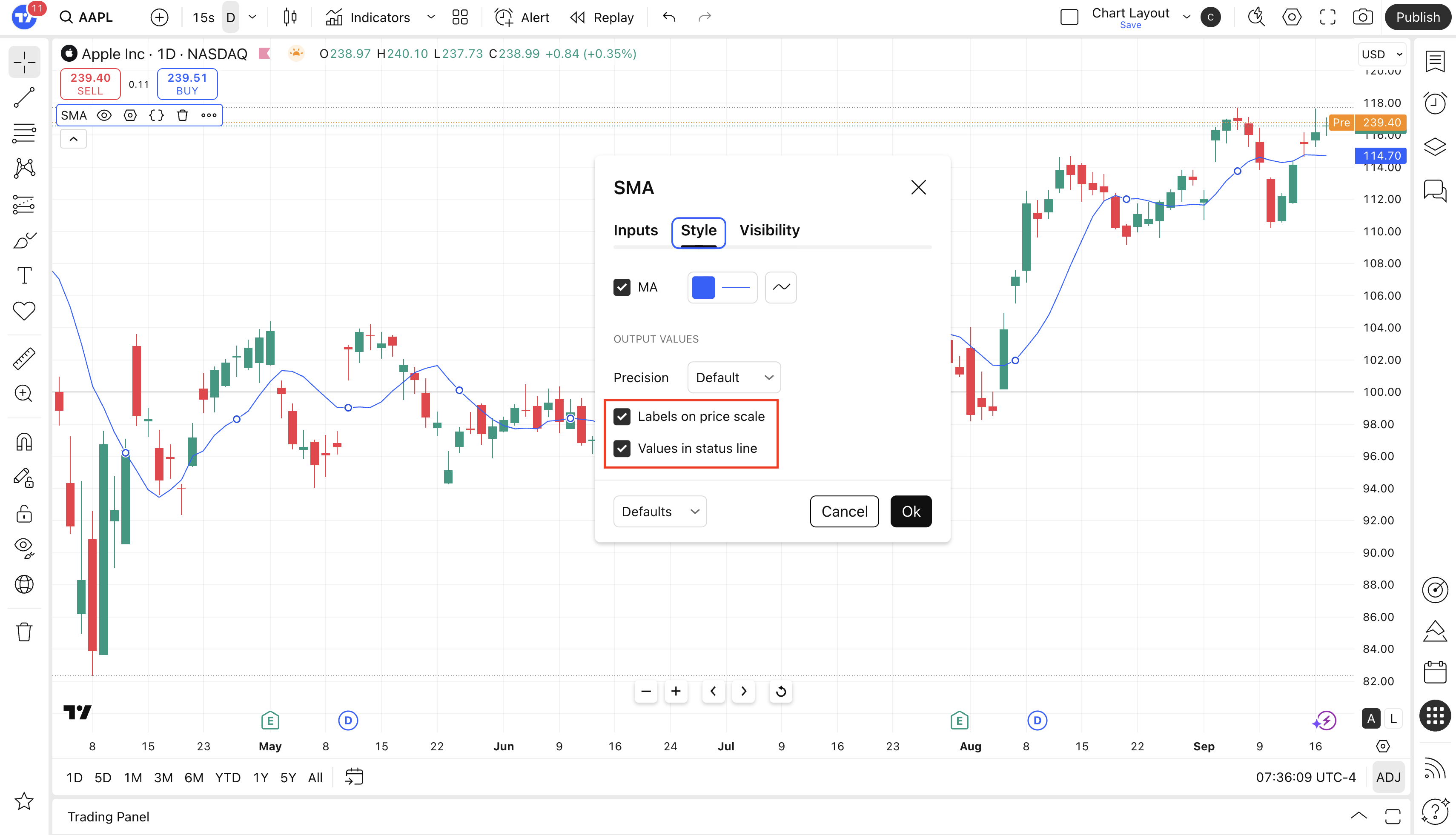 - Open the “Style” tab in the indicator settings.